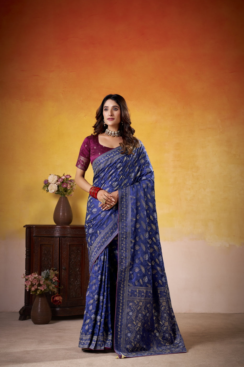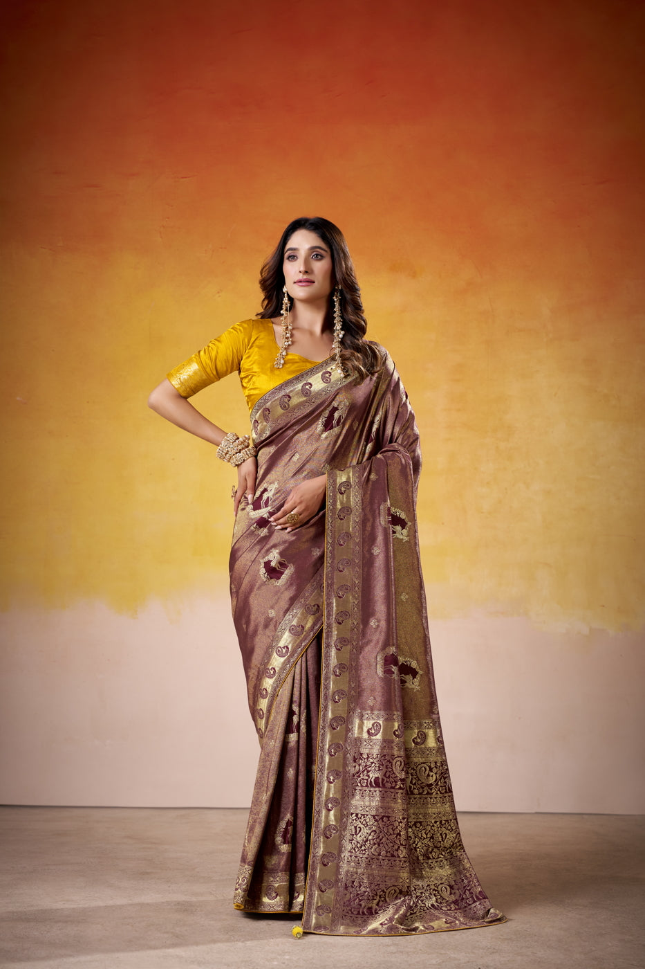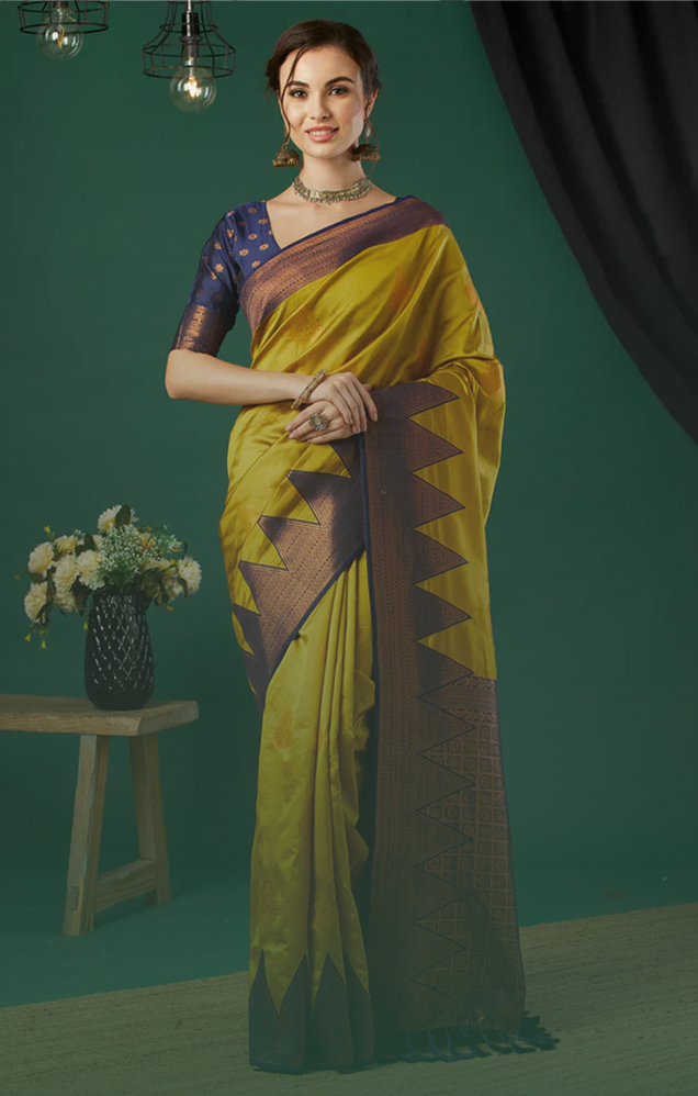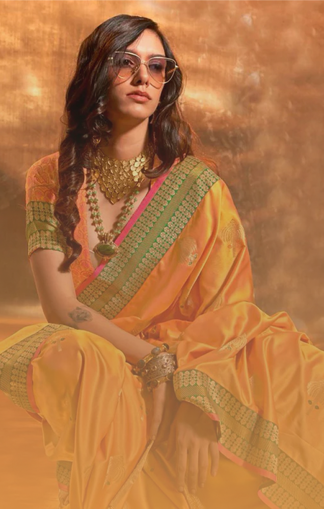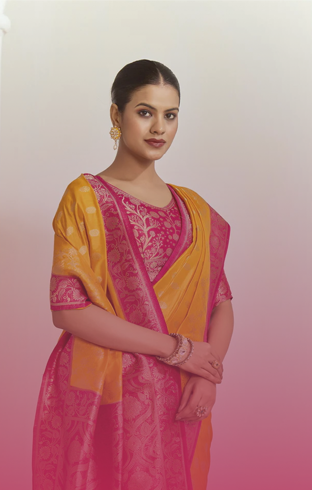 Channel timeless grace with our Regal Banarasi Silk Saree, adorned with intricate zari motifs and...
