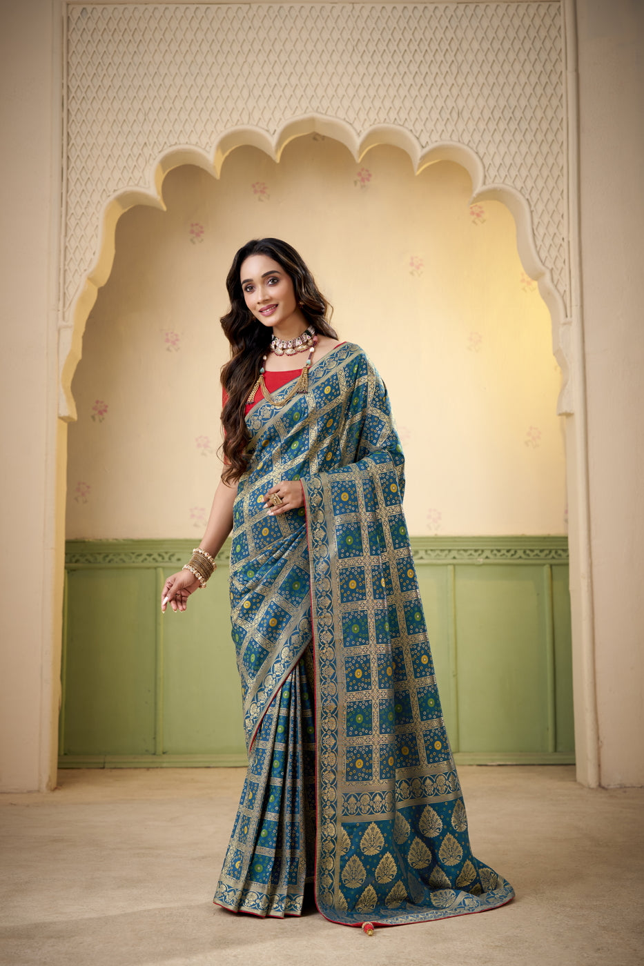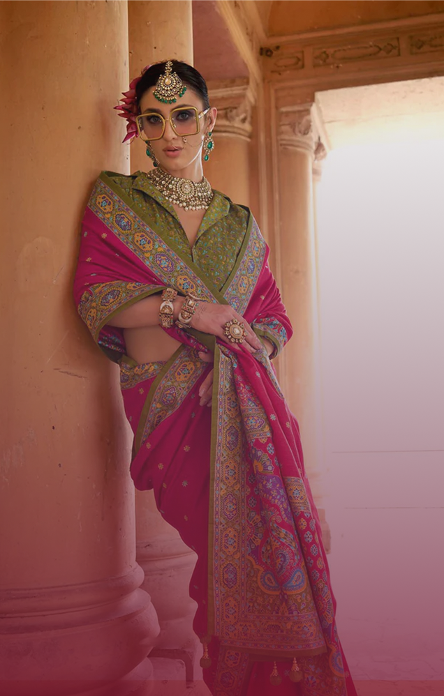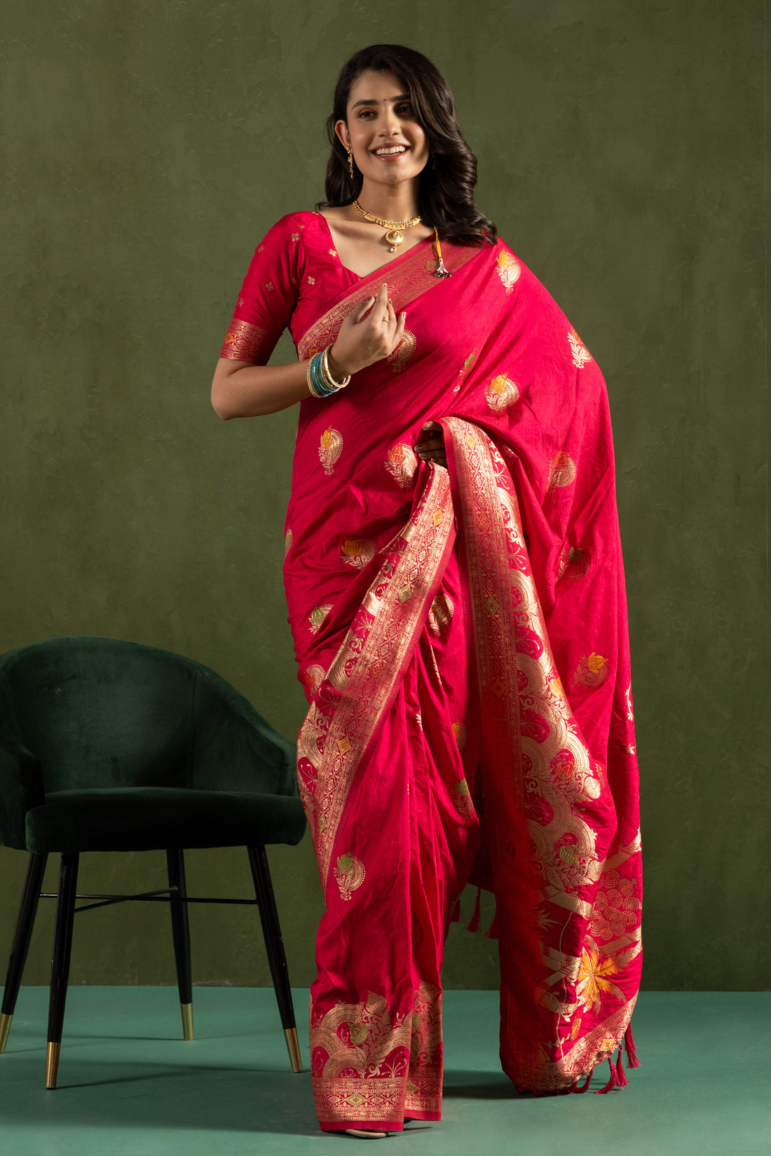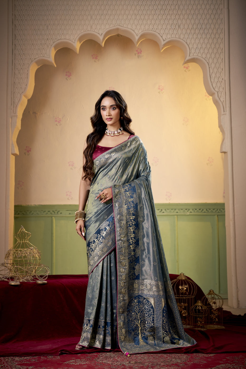Channel timeless grace with our Regal Banarasi Silk Saree, adorned with intricate zari motifs and...