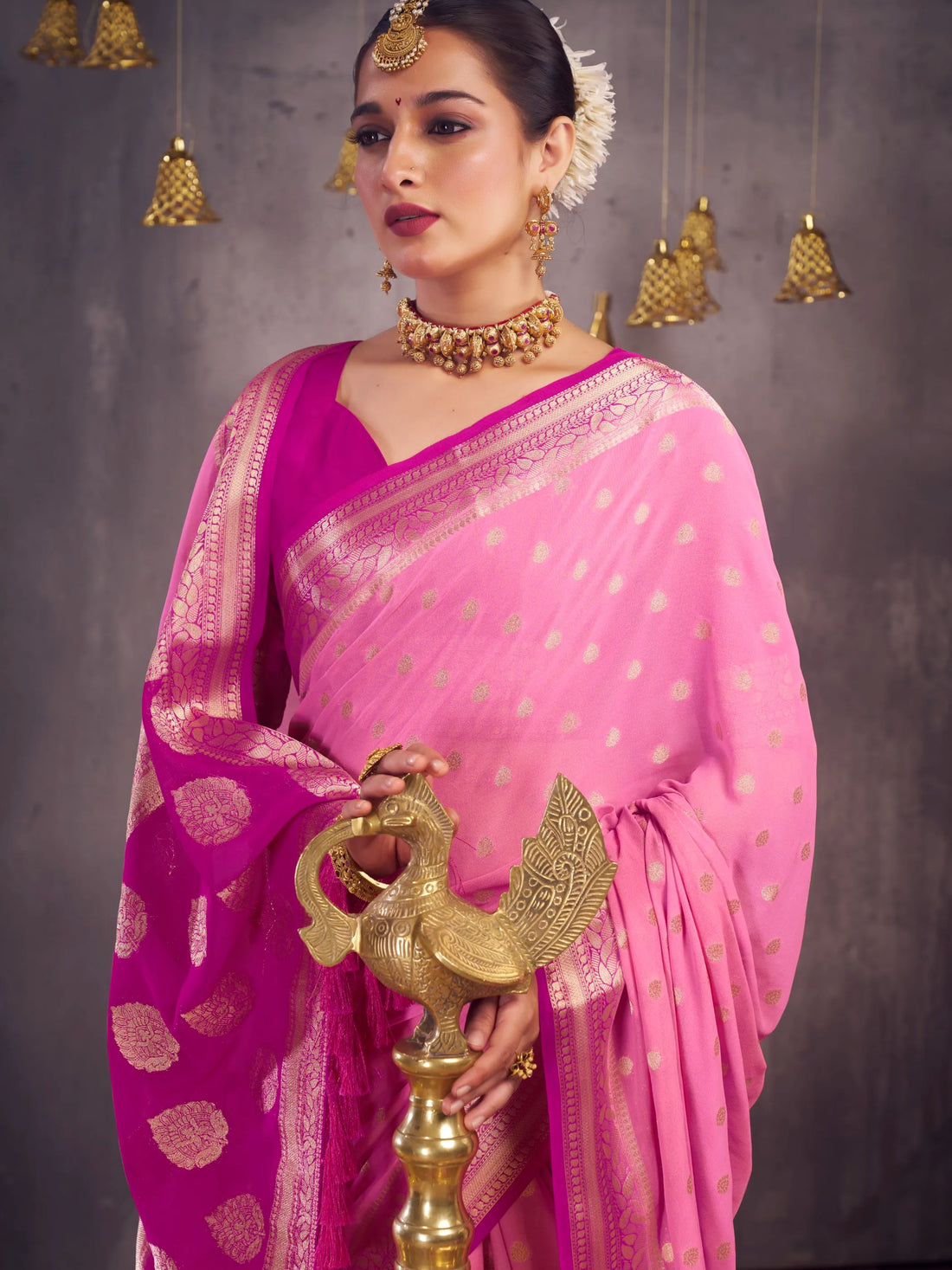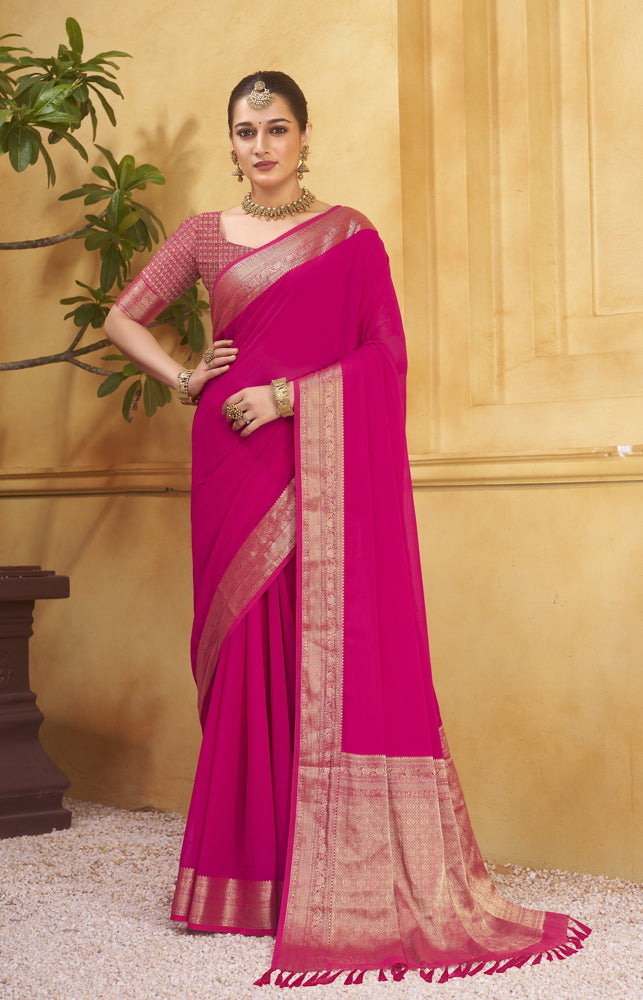 Fabric: Pure Georgette with Golden Zari Color: PinkSaree Length: 5.5 MBlouse Length : 0.8 MCare Instruction : Dry Clean OnlyManufactured /...