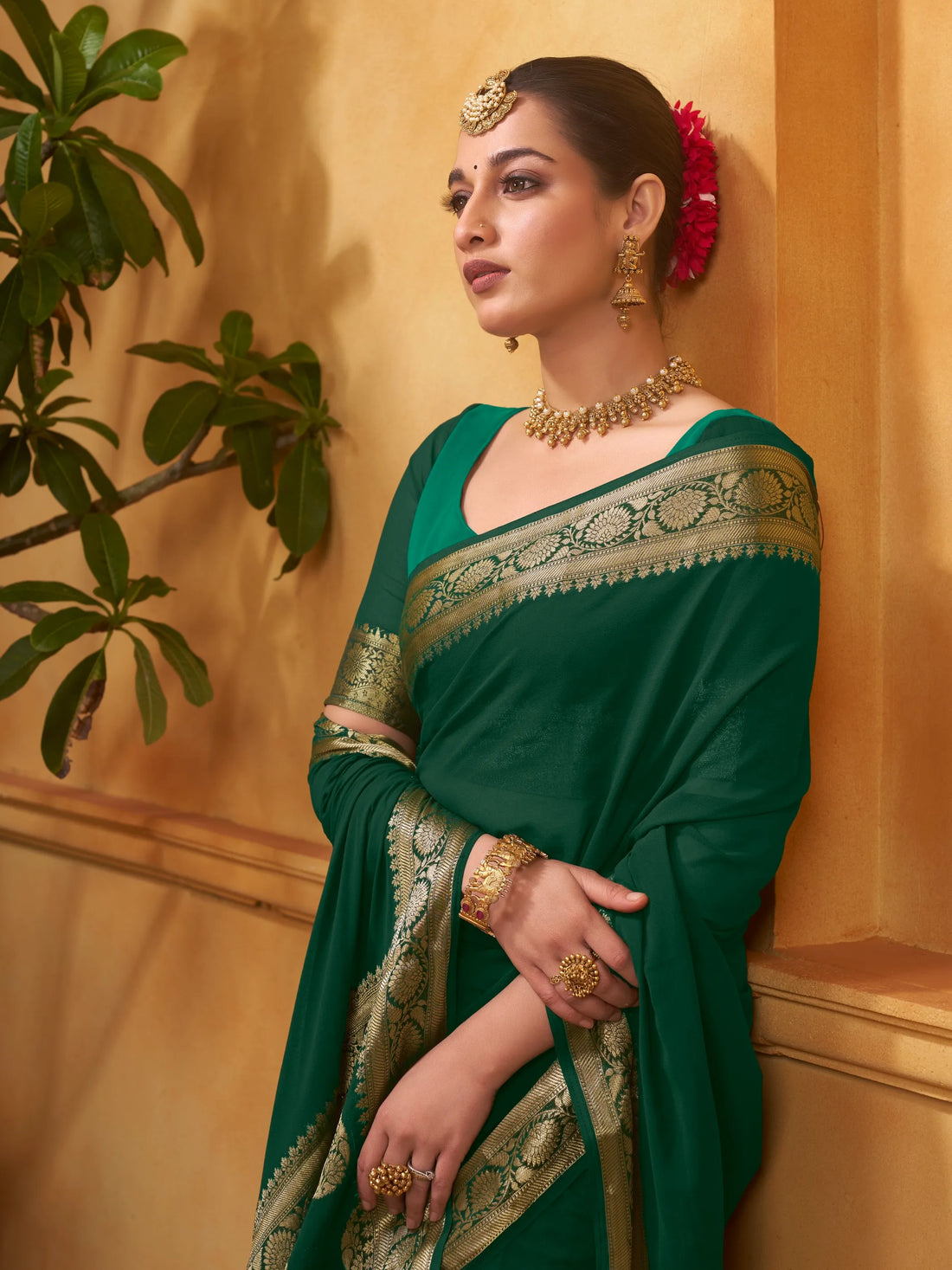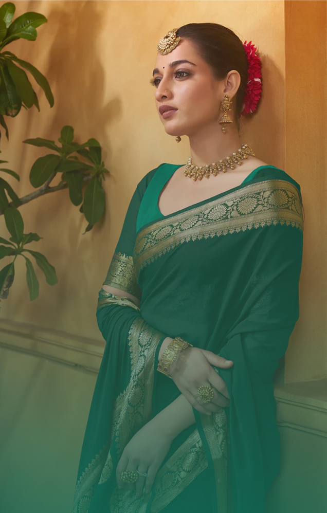 Fabric: Pure Georgette with Golden Zari Color: GreenSaree Length: 5.5 MBlouse Length : 0.8 MCare Instruction : Dry Clean OnlyManufactured /...