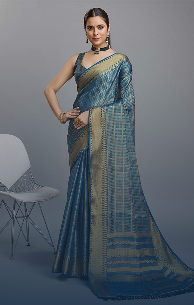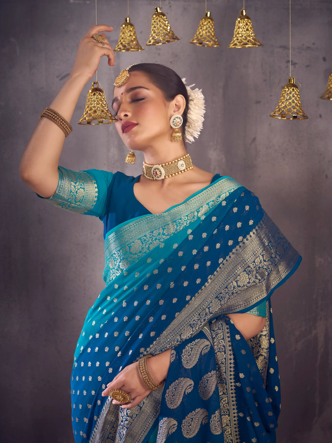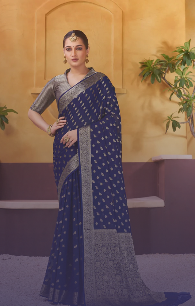 Fabric: Pure Georgette with Golden Zari Color: Aqua blueSaree Length: 5.5 MBlouse Length : 0.8 MCare Instruction : Dry Clean OnlyManufactured...