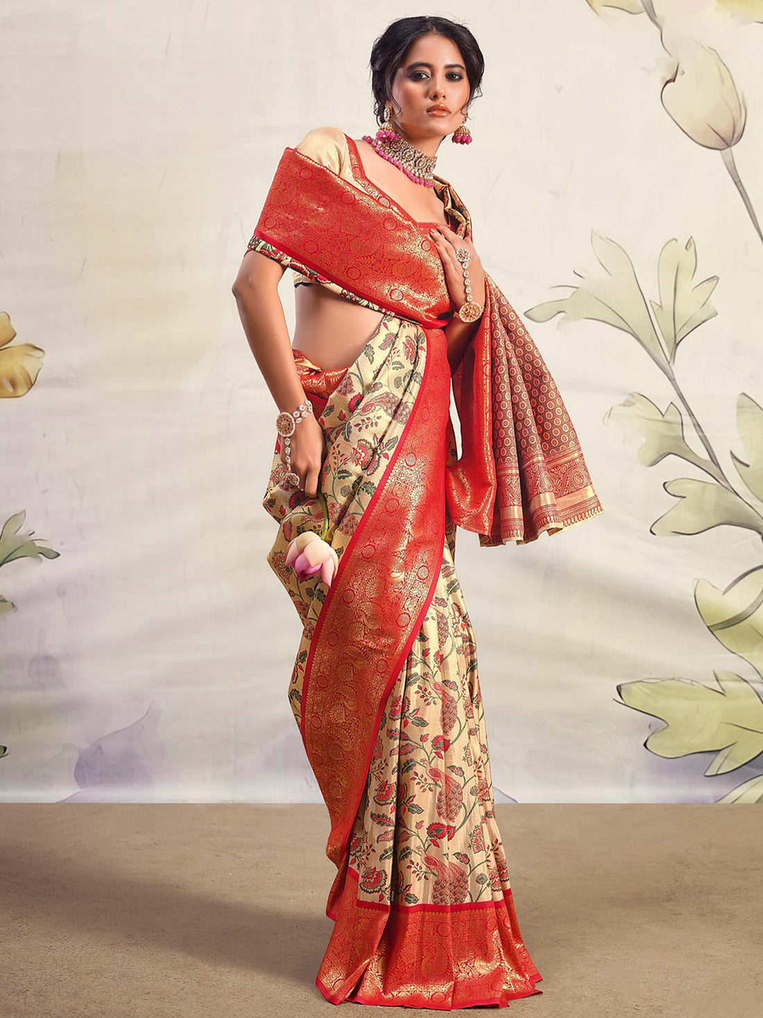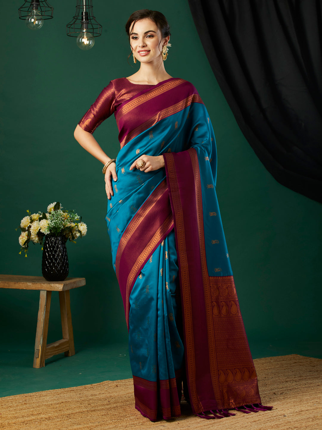 The saree is crafted from luxurious silk, likely a Kanjivaram variant, known for its rich texture...