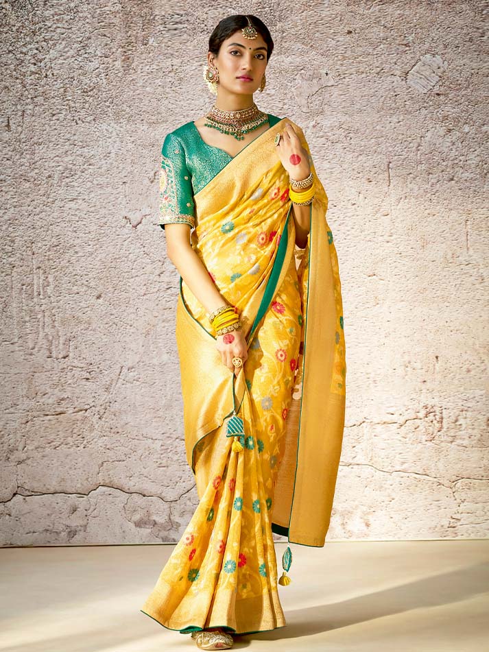 Fabric: Banarasi Silk Saree Length: 5.5 MBlouse Length : 0.8 MCare Instruction : Dry Clean OnlyManufactured / Packed by : FlouriousInclusive...