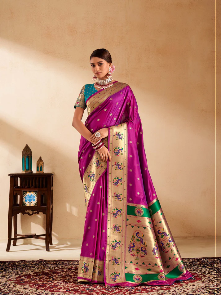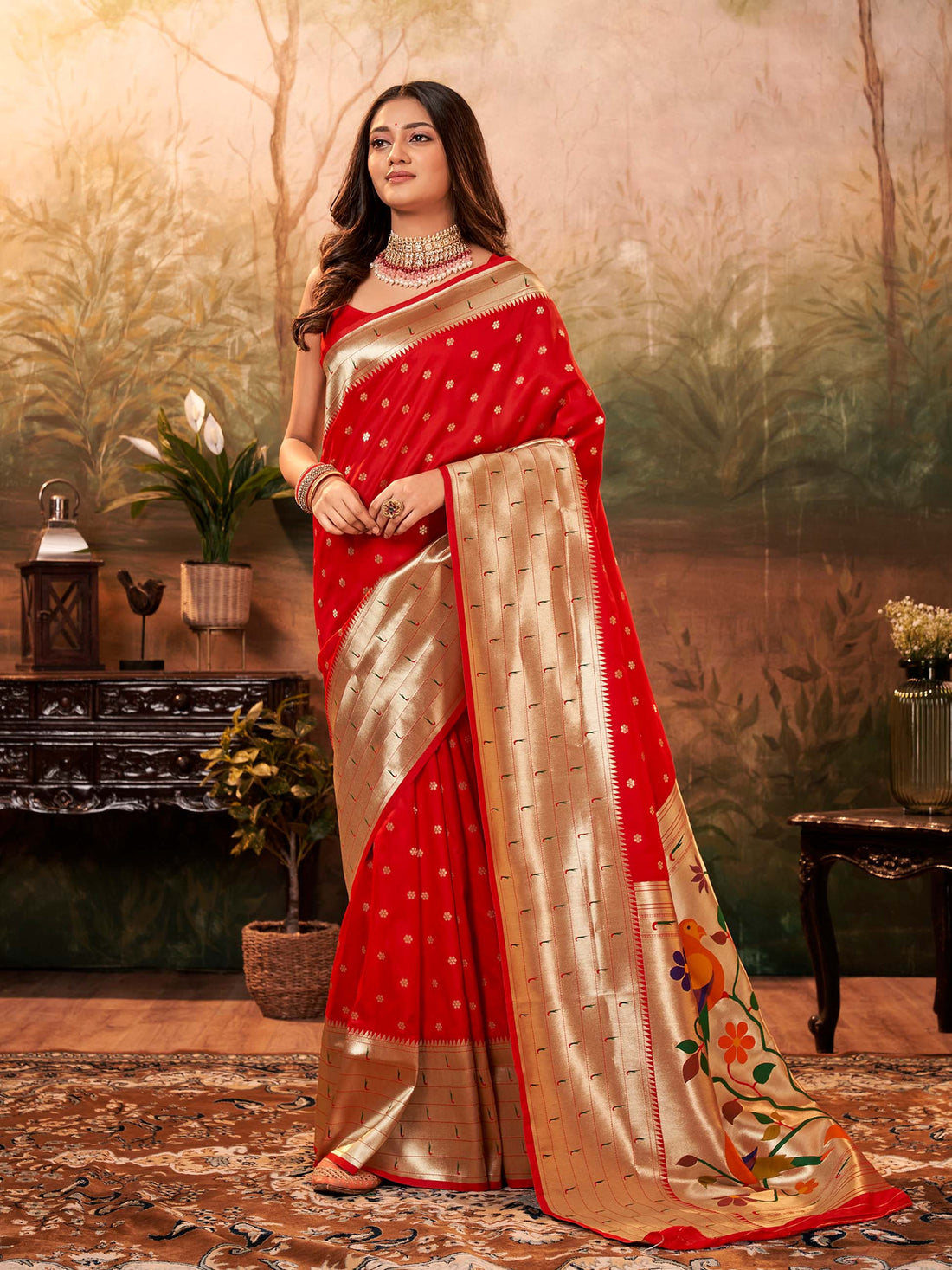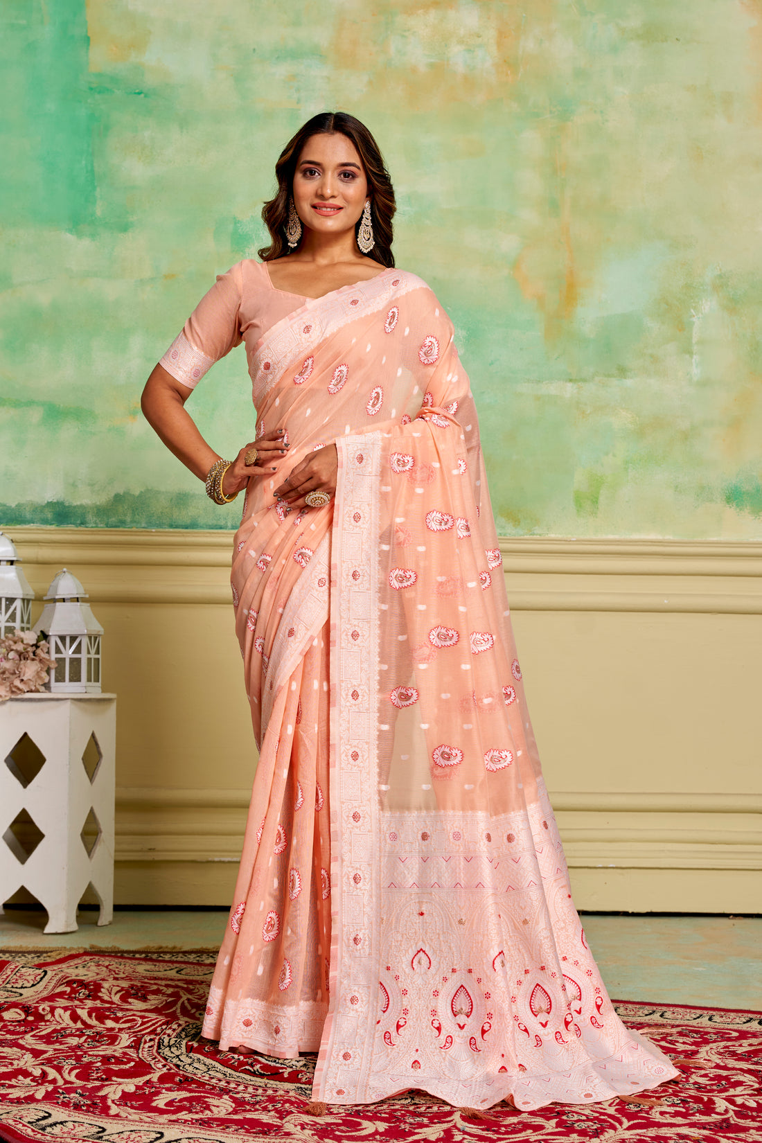 This graceful silk saree showcases a fine display of craftsmanship with dainty woven motifs scattered...
