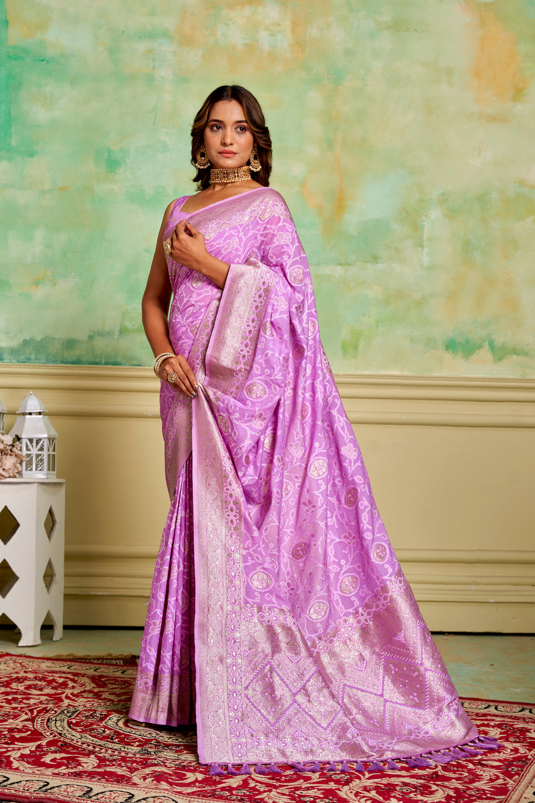 Elevate your style with the Lavender, Beige, Brown and Red Organza Saree - a radiant...