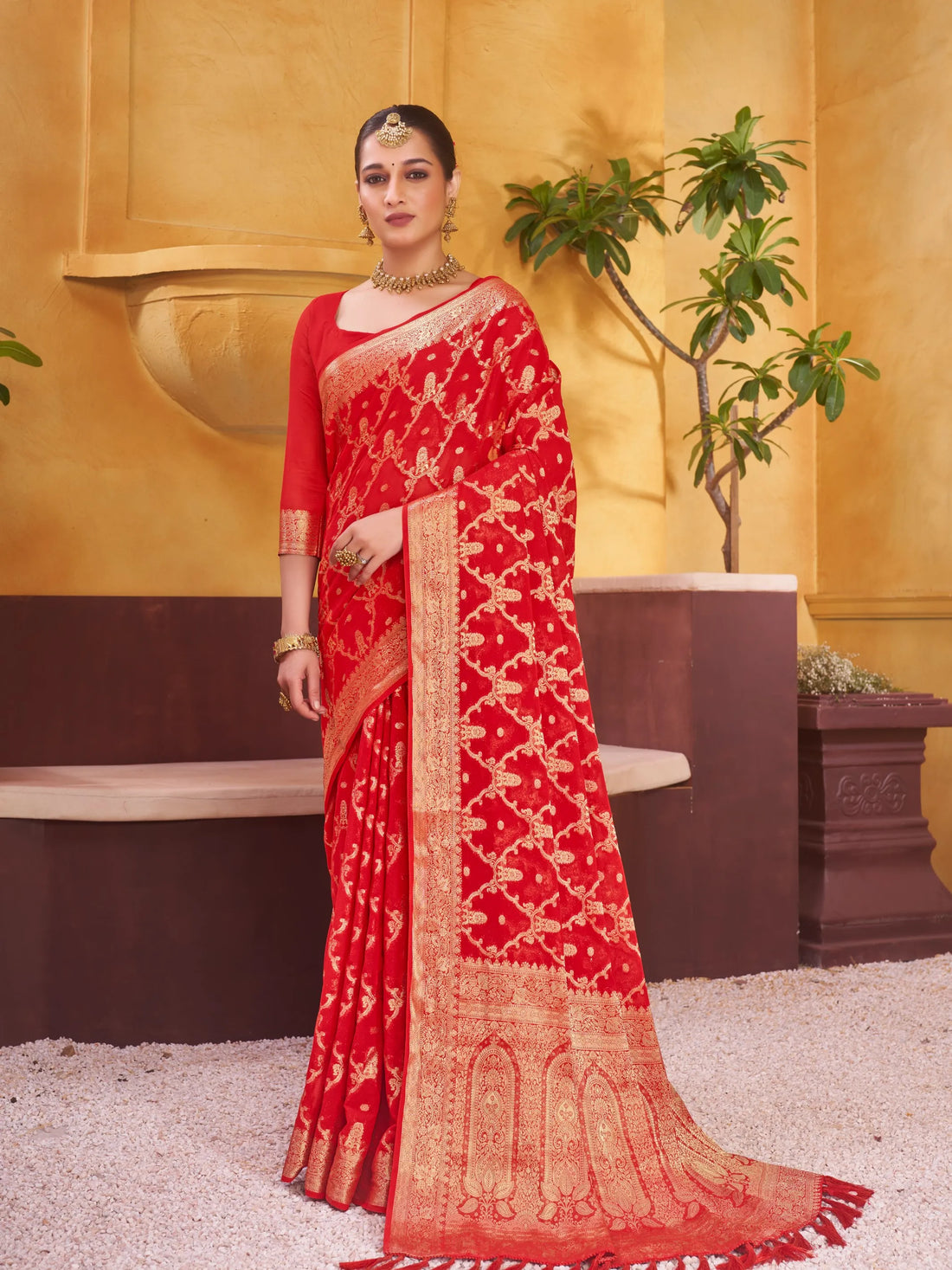 Fabric: Pure Georgette with Golden Zari Color: RedSaree Length: 5.5 MBlouse Length : 0.8 MCare Instruction : Dry Clean OnlyManufactured /...