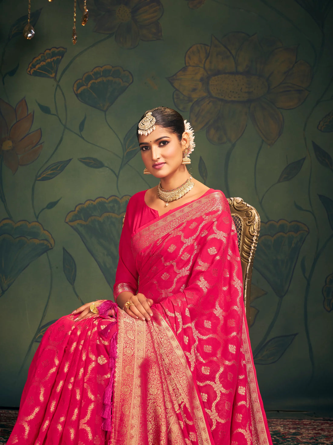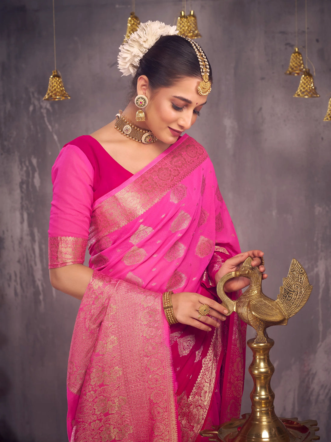Fabric: Pure Georgette with Golden Zari Color: Pink Saree Length: 5.5 MBlouse Length : 0.8 MCare Instruction : Dry Clean OnlyManufactured /...