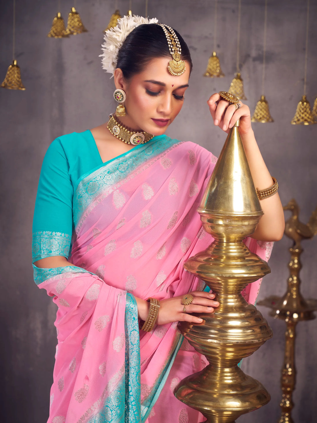 Product Details:Fabric: Pure Georgette with Pink Zari Color: AquaSaree Length: 5.5 MBlouse Length : 0.8 MCare Instruction : Dry Clean OnlyManufactured...