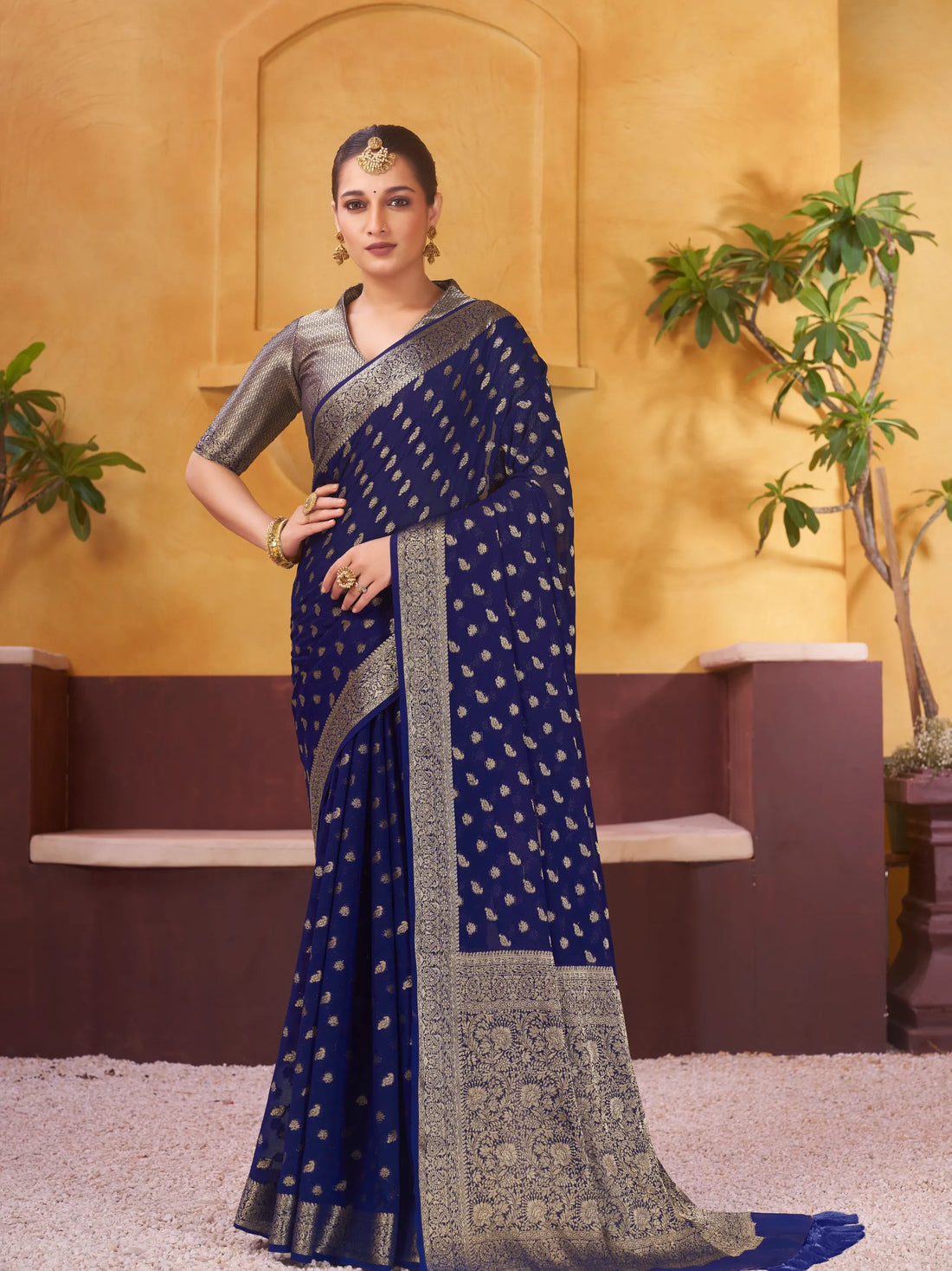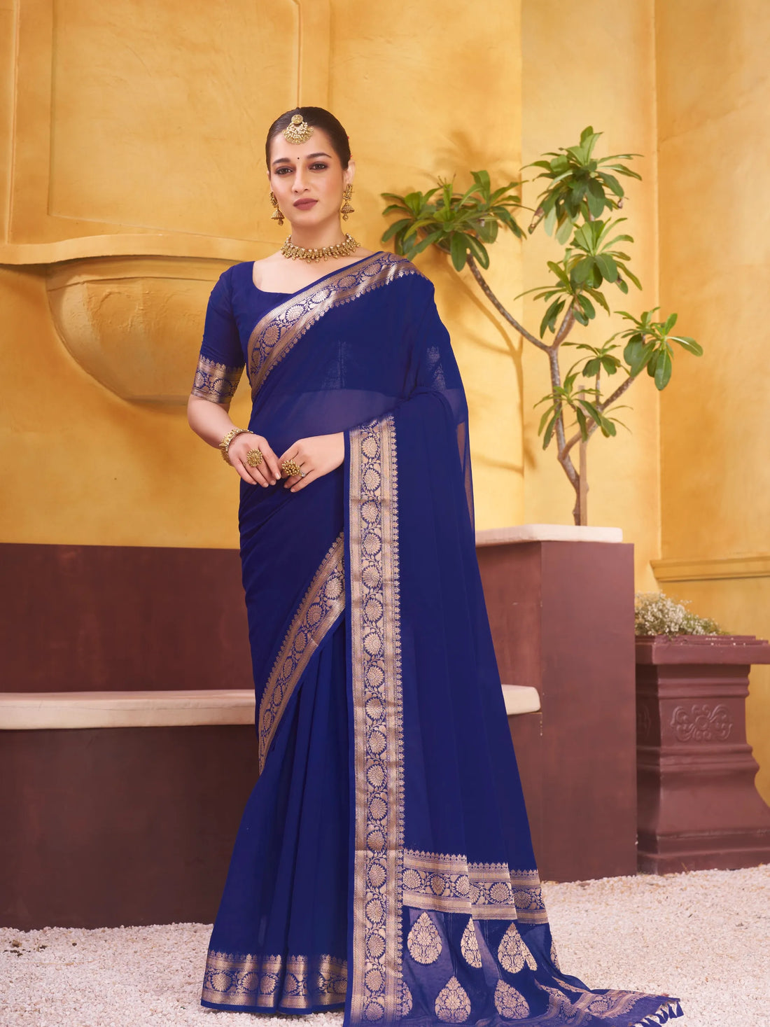Fabric: Pure Georgette with Golden Zari Color: Blue Saree Length: 5.5 MBlouse Length : 0.8 MCare Instruction : Dry Clean OnlyManufactured /...