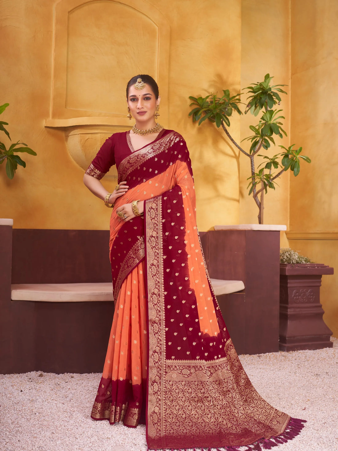 Fabric: Pure Georgette with Golden Zari Color: OrangeSaree Length: 5.5 MBlouse Length : 0.8 MCare Instruction : Dry Clean OnlyManufactured /...