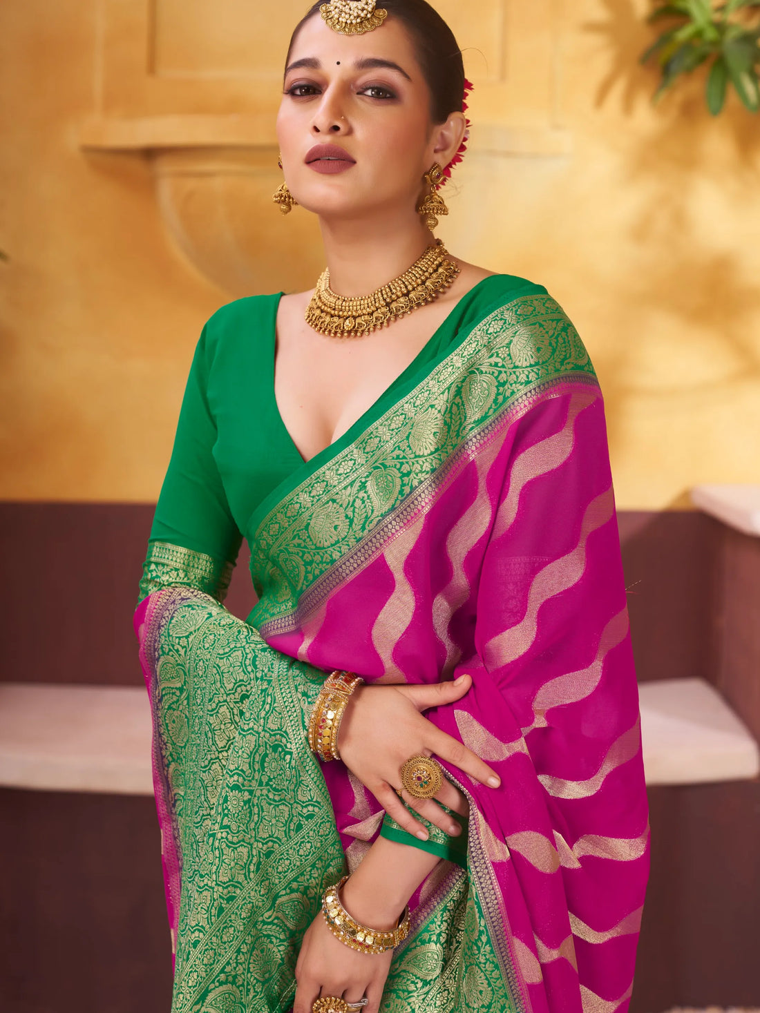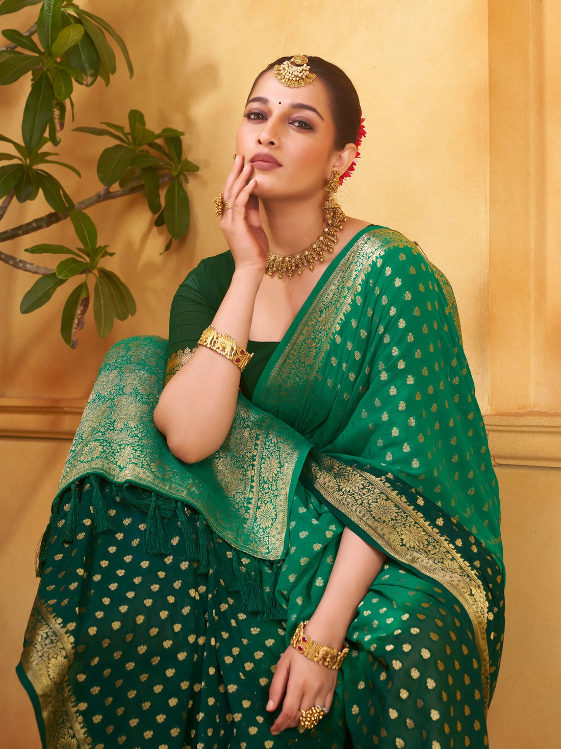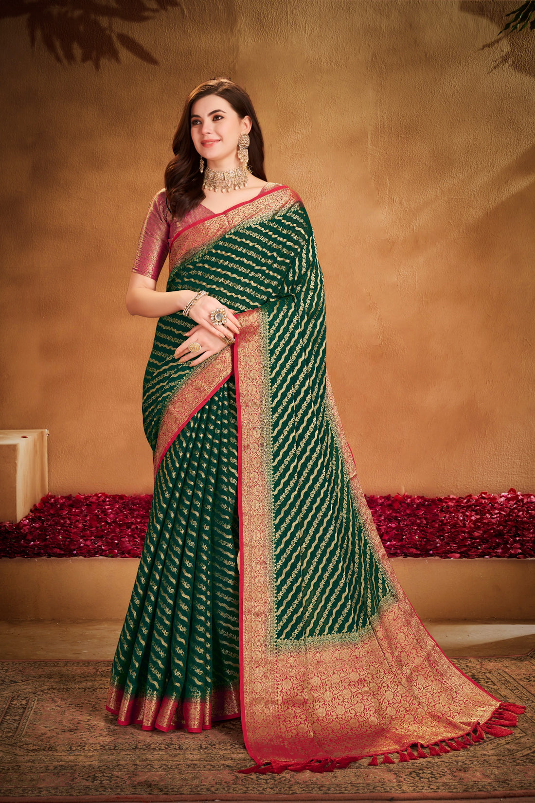 Product Details:Fabric: Pure Georgette with Golden Zari Color: Green Saree Length: 5.5 MBlouse Length : 0.8 MCare Instruction : Dry...