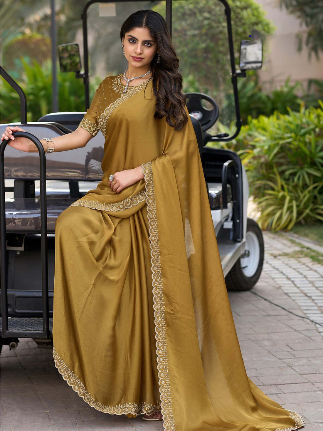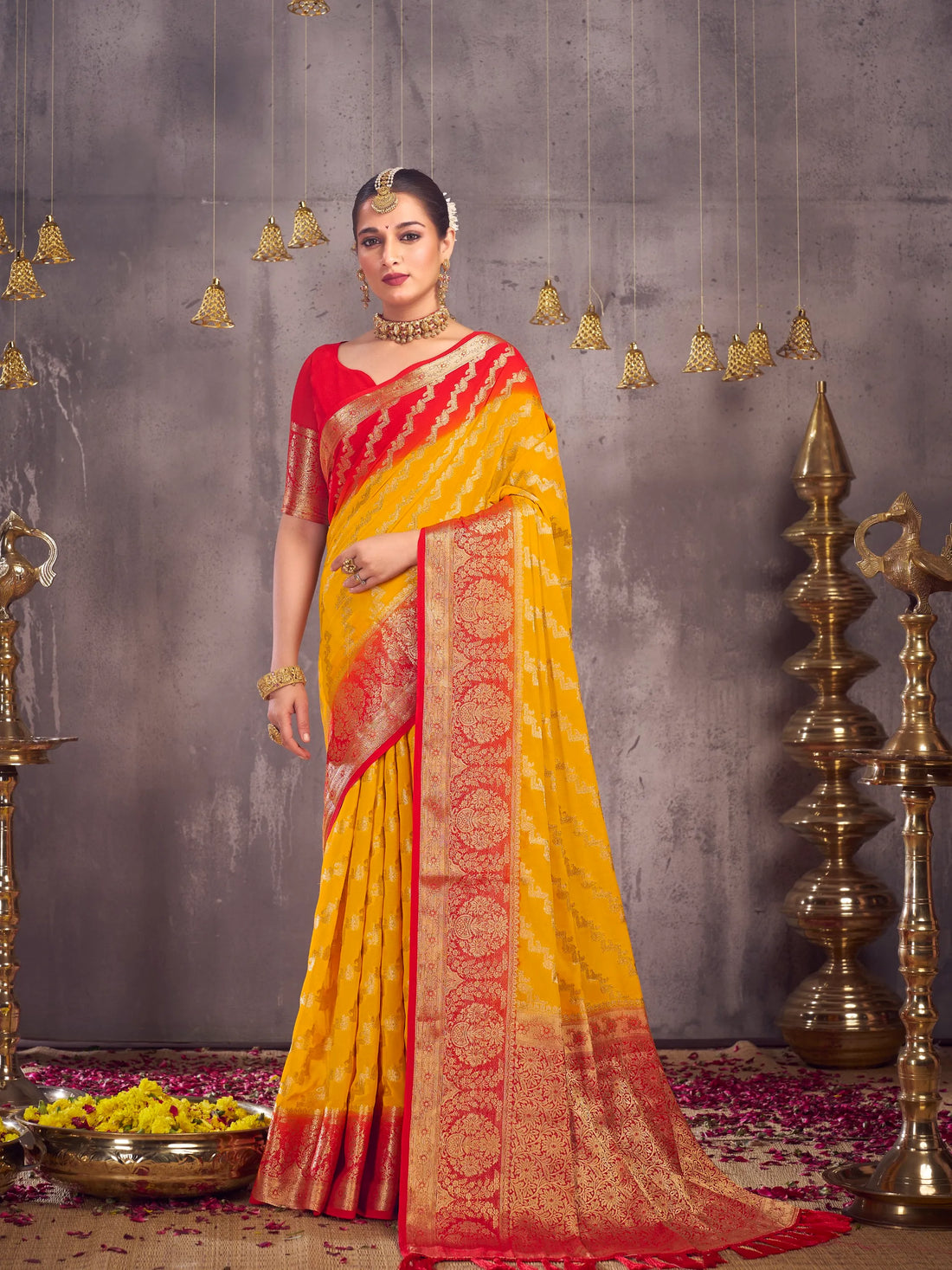 Fabric: Pure Georgette with Golden Zari Color: YellowSaree Length: 5.5 MBlouse Length : 0.8 MCare Instruction : Dry Clean OnlyManufactured /...