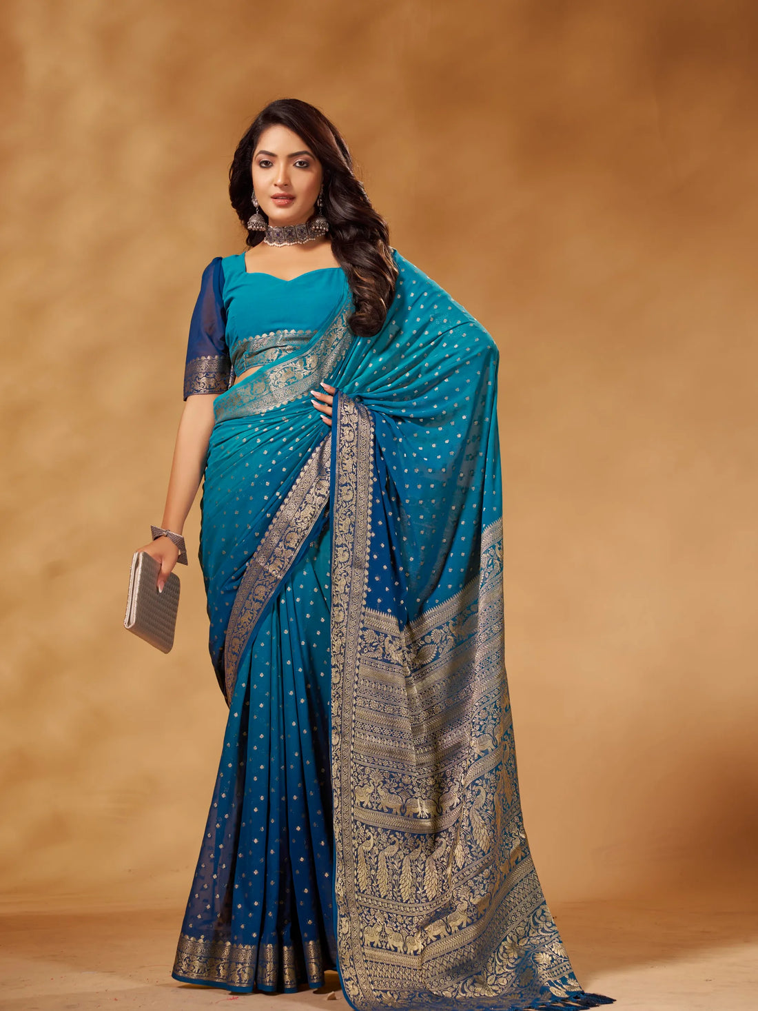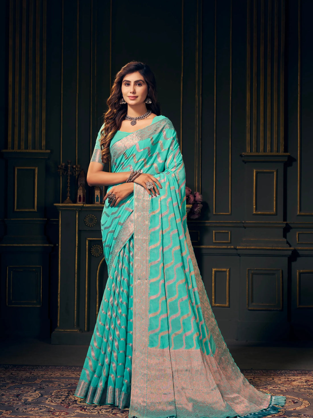 Fabric: Pure Georgette with Golden Zari Color: Aqua blueSaree Length: 5.5 MBlouse Length : 0.8 MCare Instruction : Dry Clean OnlyManufactured...