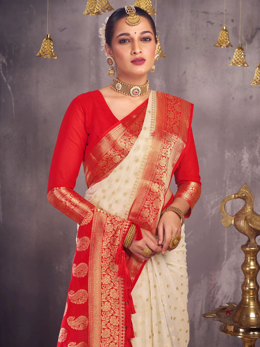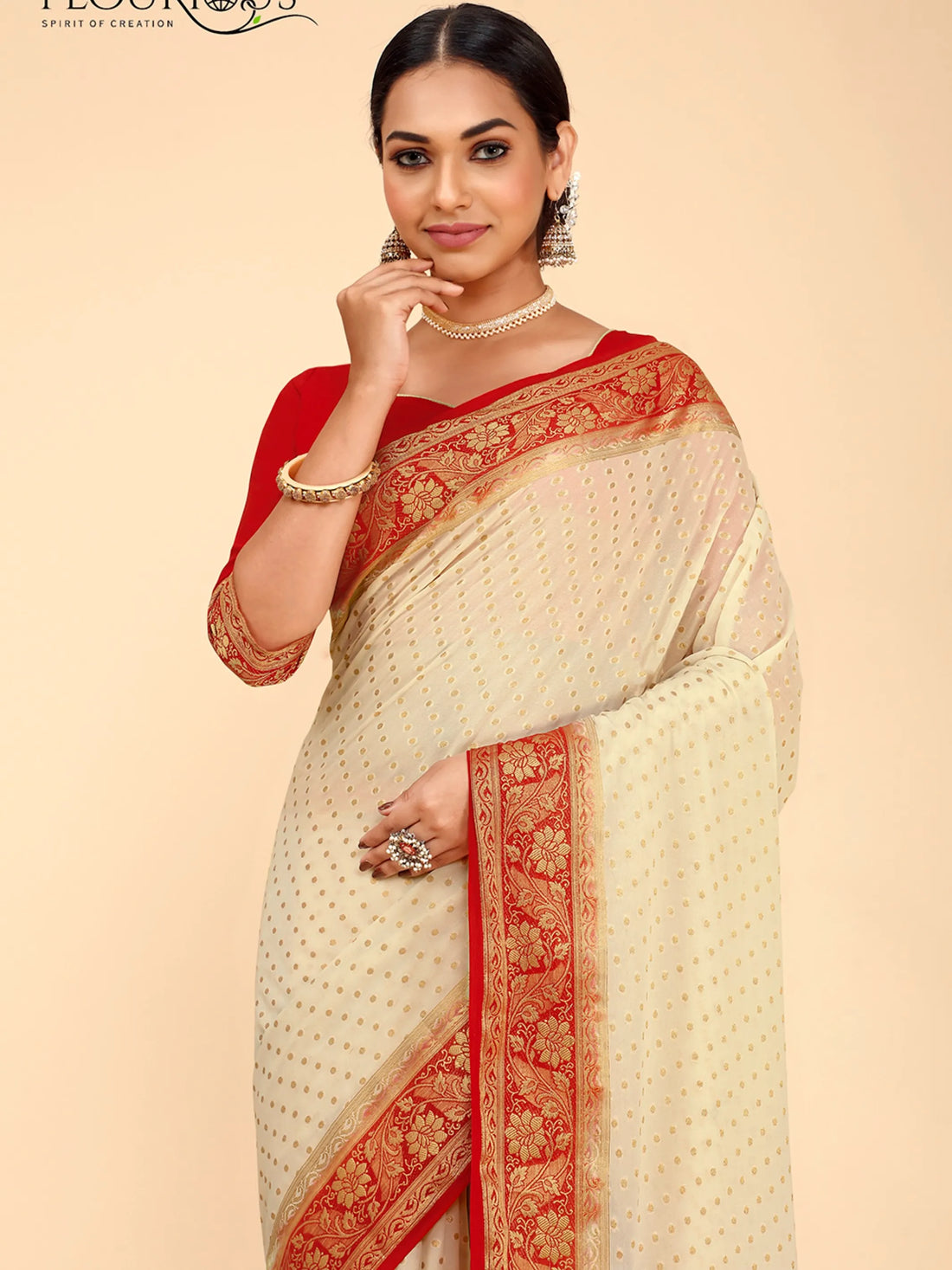 Product Details:Fabric: Pure Georgette with Golden Zari Color: WhiteSaree Length: 5.5 MBlouse Length : 0.8 MCare Instruction : Dry Clean OnlyManufactured...