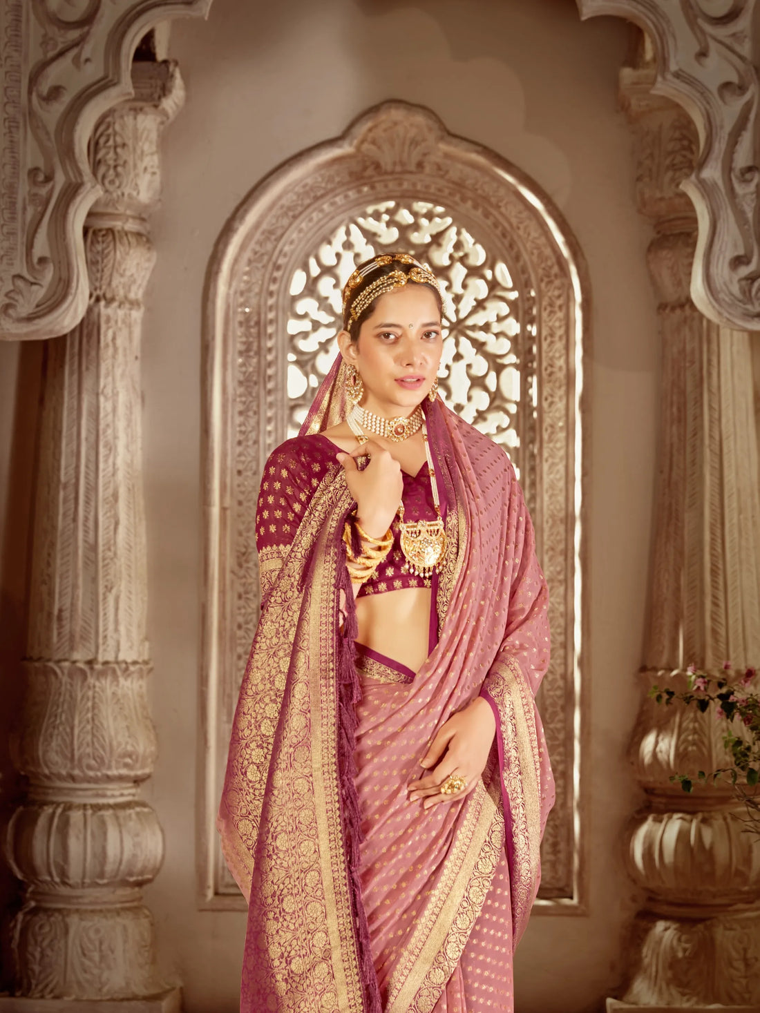 Product Details:Fabric: Pure Georgette with Golden Zari Color: PinkSaree Length: 5.5 MBlouse Length : 0.8 MCare Instruction : Dry Clean OnlyManufactured...