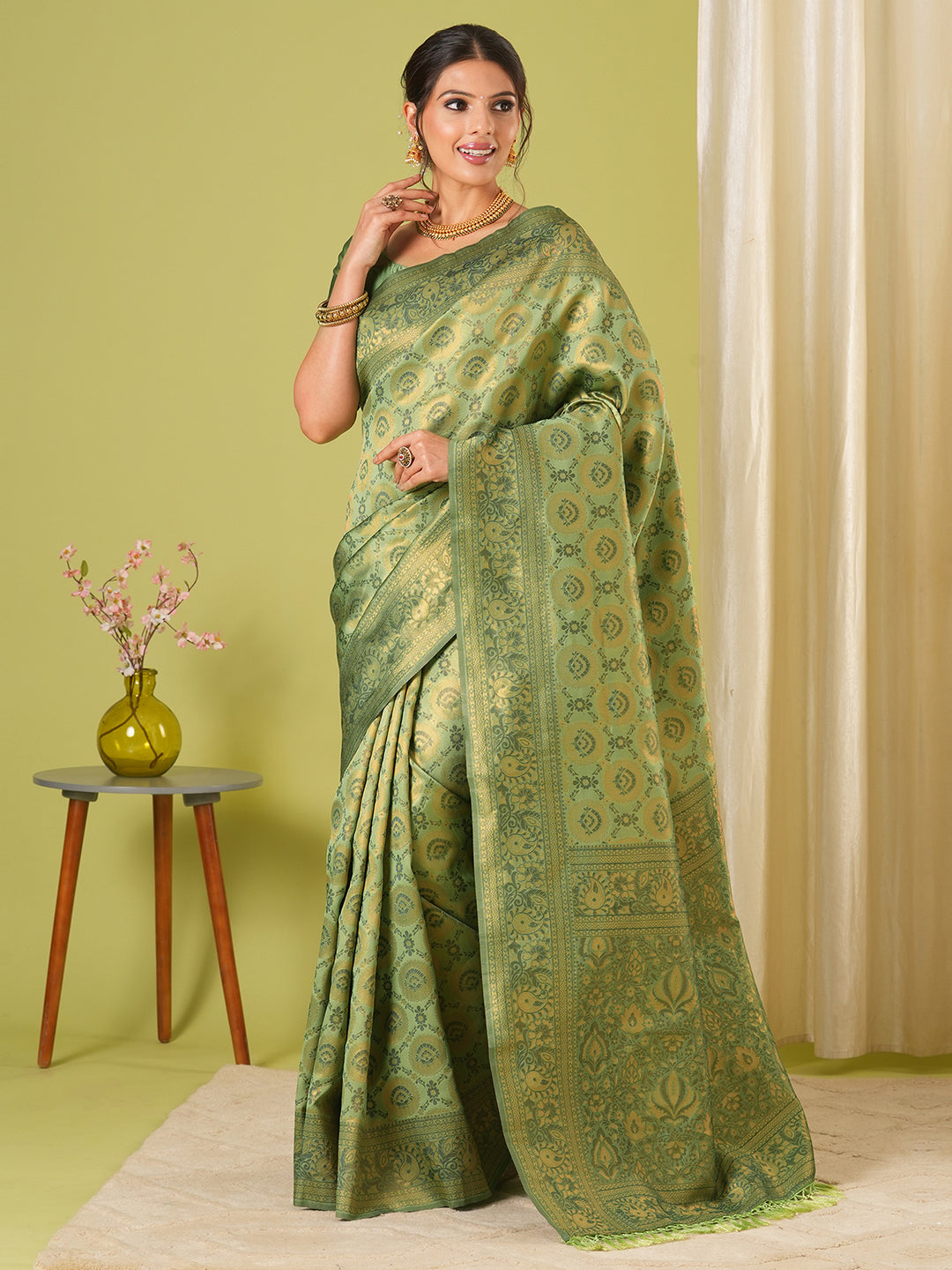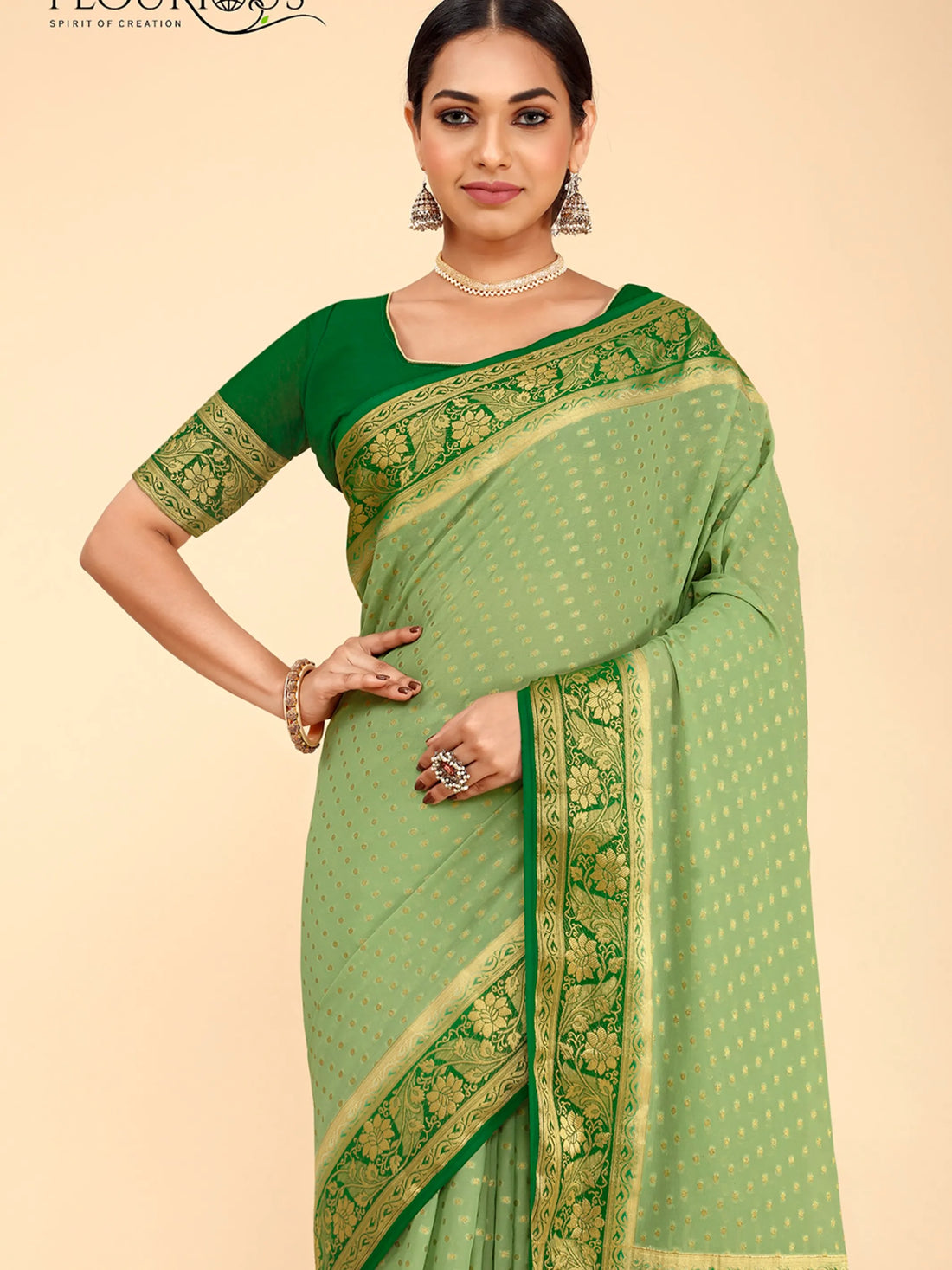 Product Details:Fabric: Pure Georgette with Golden Zari Color: Light GreenSaree Length: 5.5 MBlouse Length : 0.8 MCare Instruction : Dry Clean...
