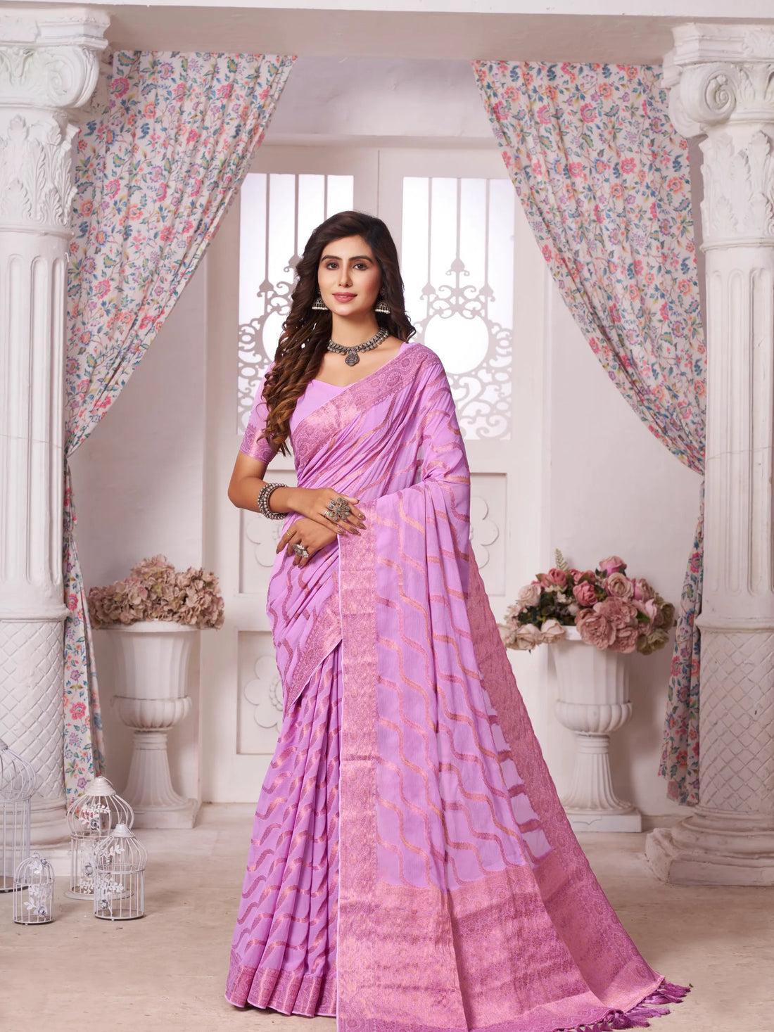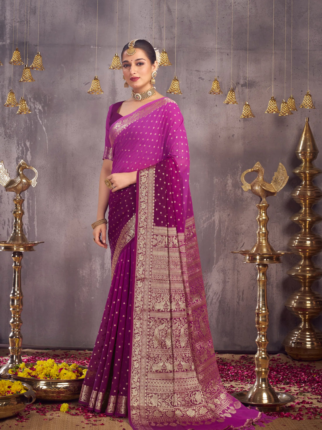 Product Details: Fabric: Pure Georgette with Golden Zari Color: Purple Saree Length: 5.5 M Blouse Length : 0.8 M...
