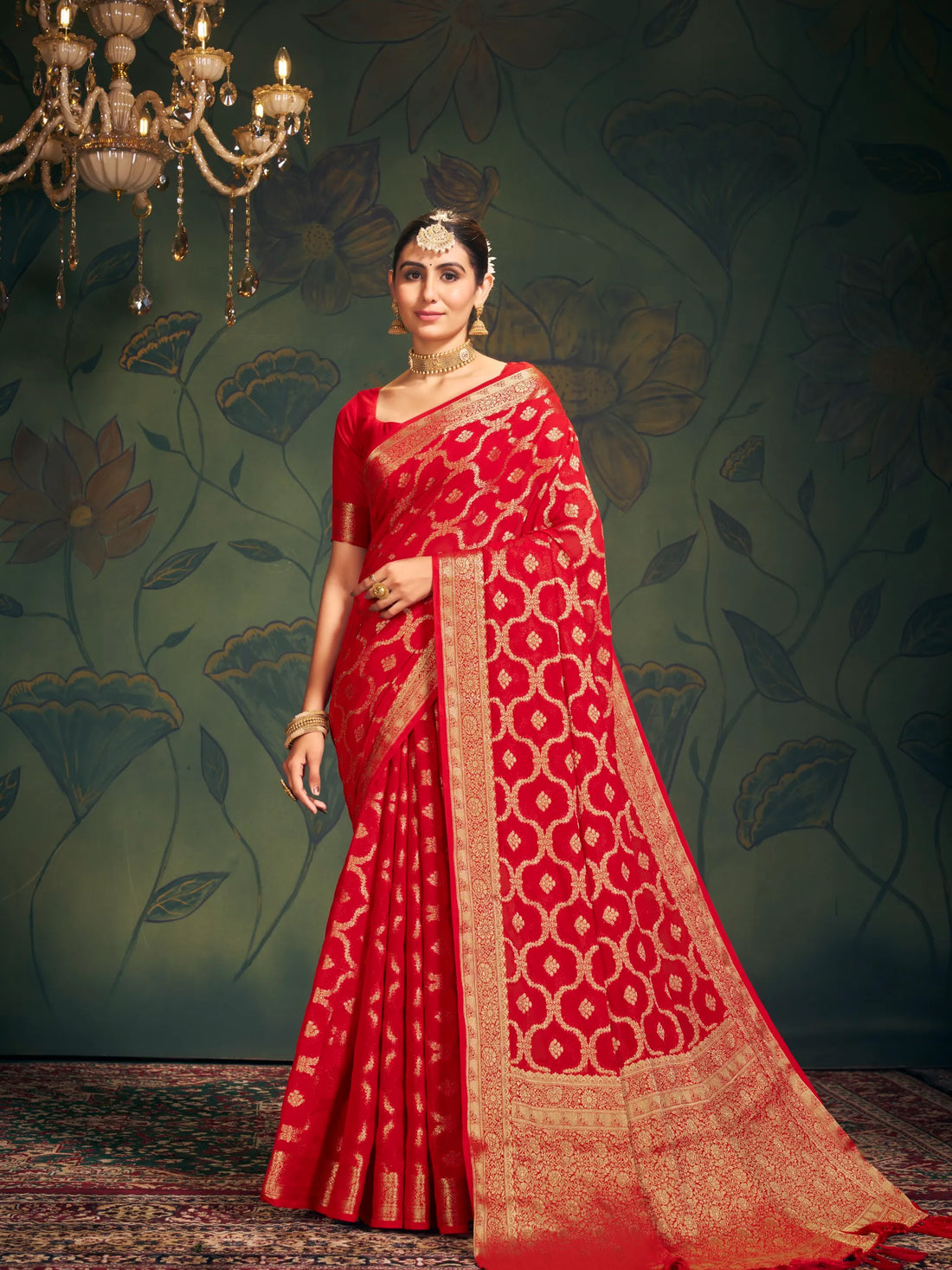 Fabric: Pure Georgette with Golden Zari Color: RedSaree Length: 5.5 MBlouse Length : 0.8 MCare Instruction : Dry Clean OnlyManufactured /...