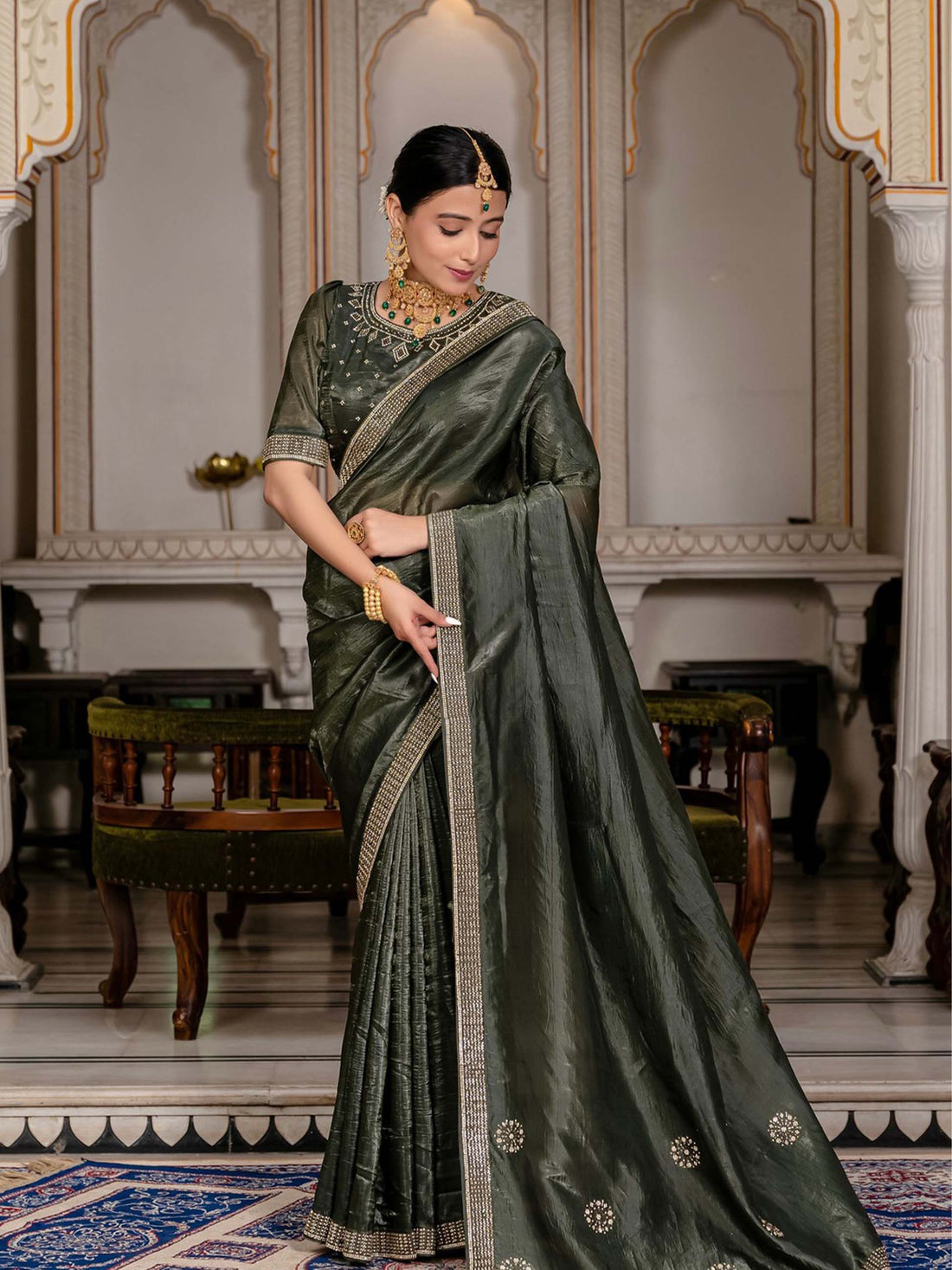 Fabric: Soft Silk Tissue SKU: RJP Saree Length: 5.5 MBlouse Length : 0.8 MCare Instruction : Dry Clean...