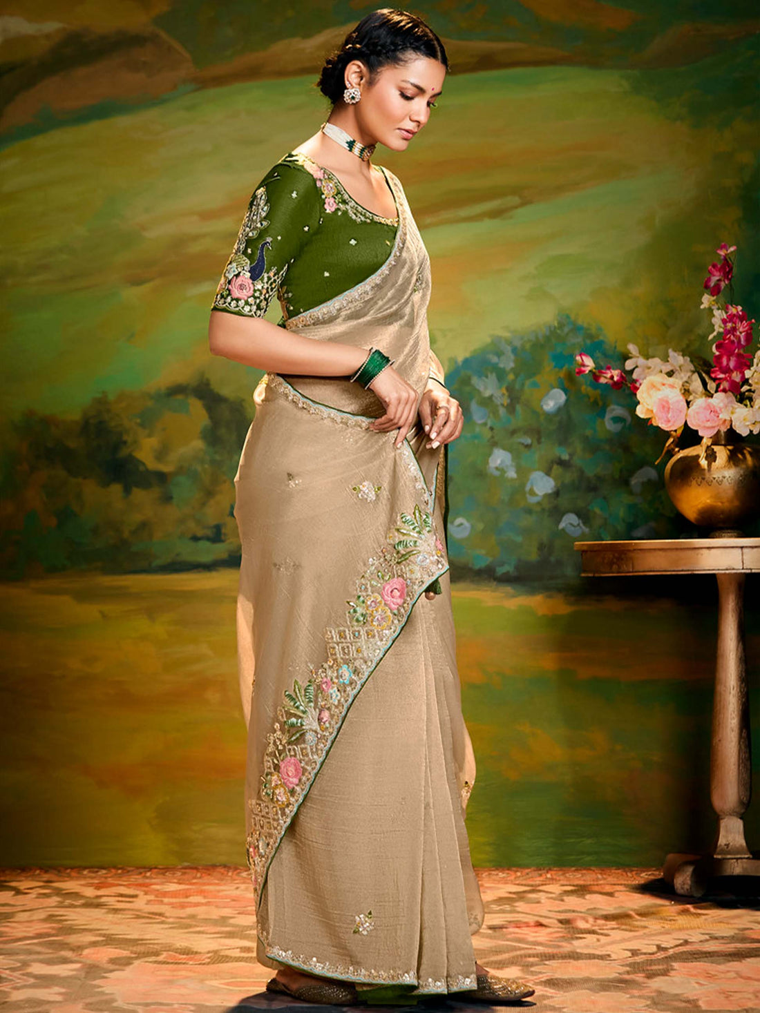 Elevate your ethnic wardrobe with this beautifully embroidered organza saree, featuring delicate floral motifs and...