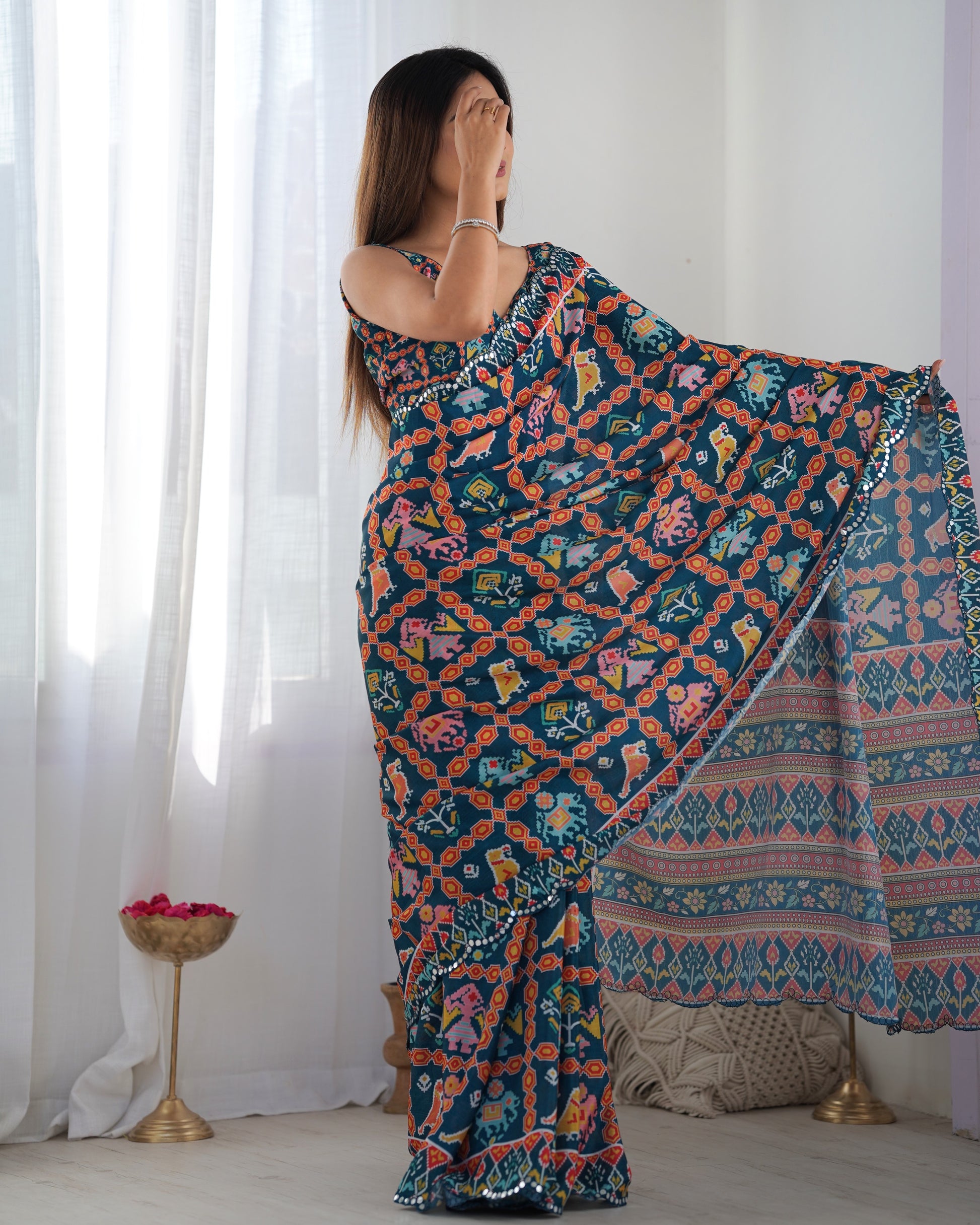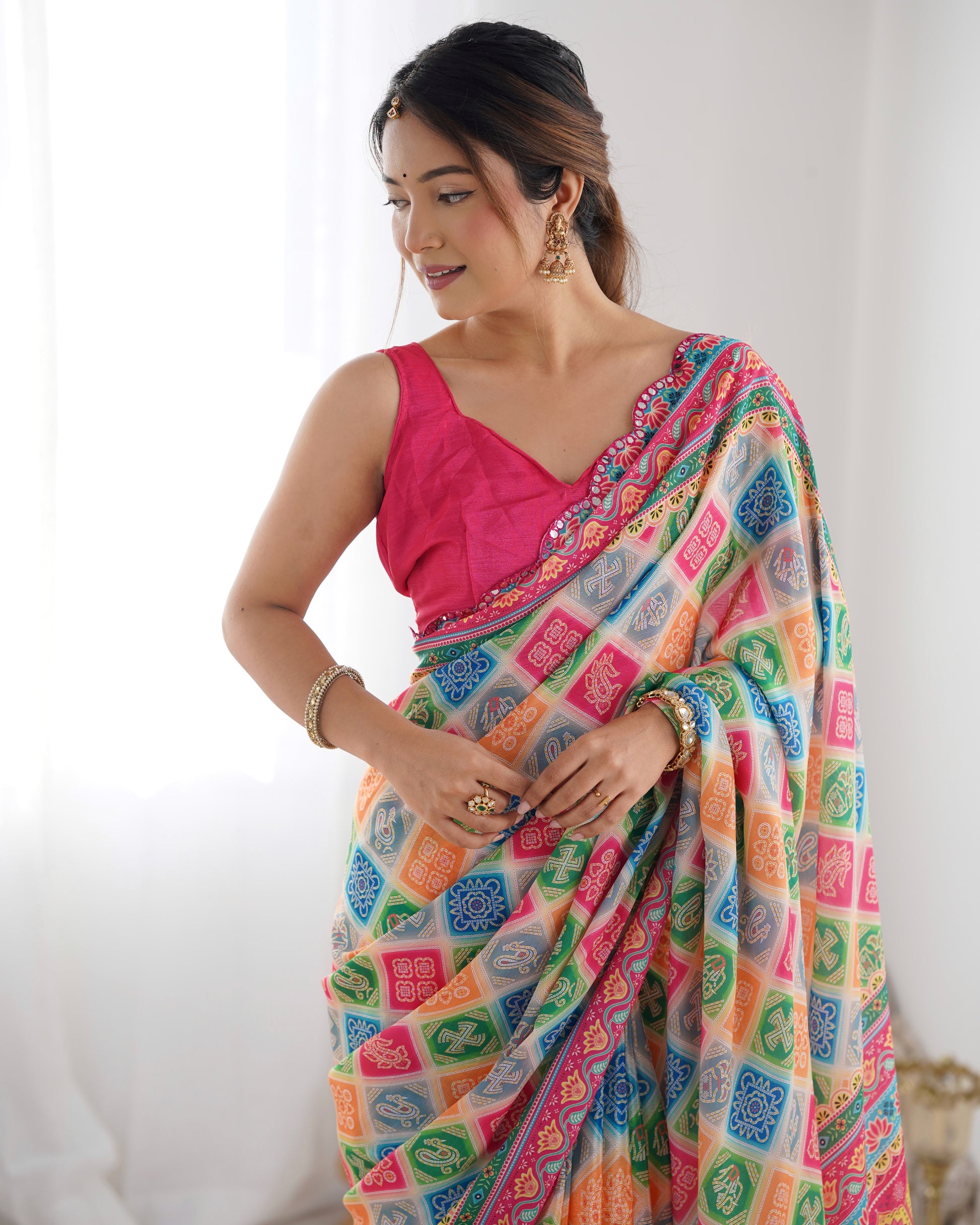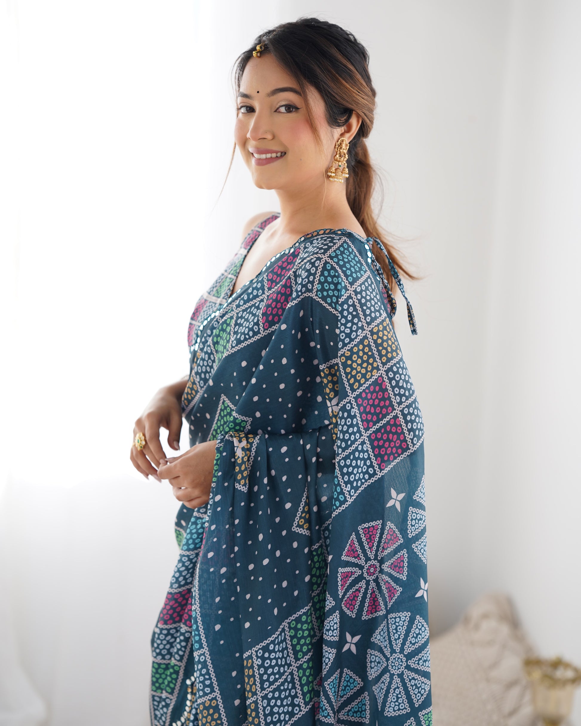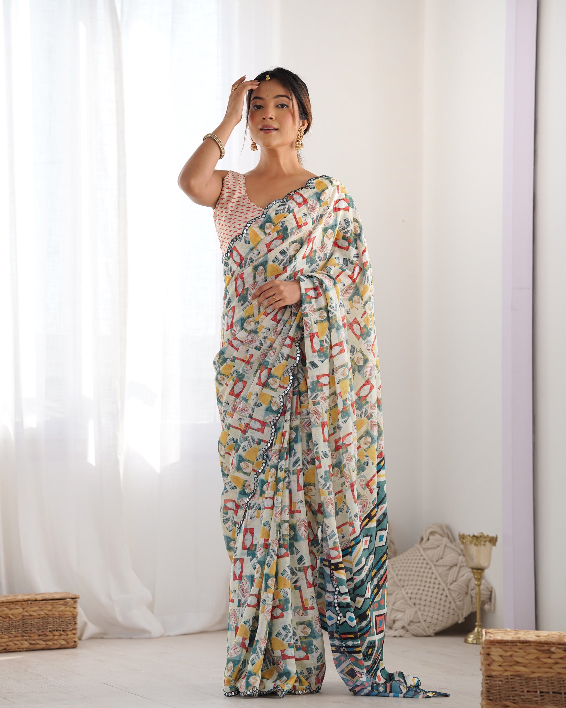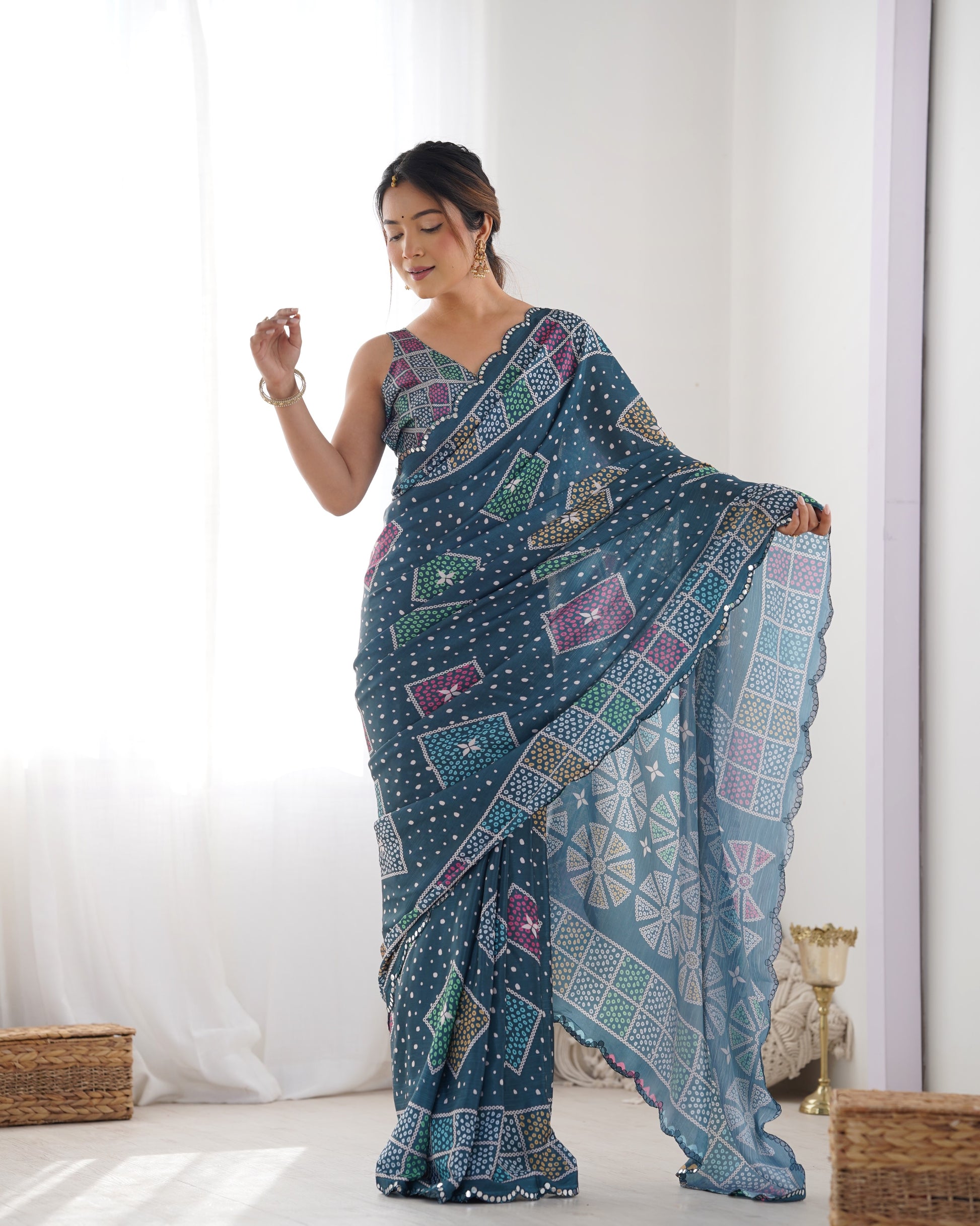 Work :- Print Work with Beautiful Kutchi Work Mirror Lace Border