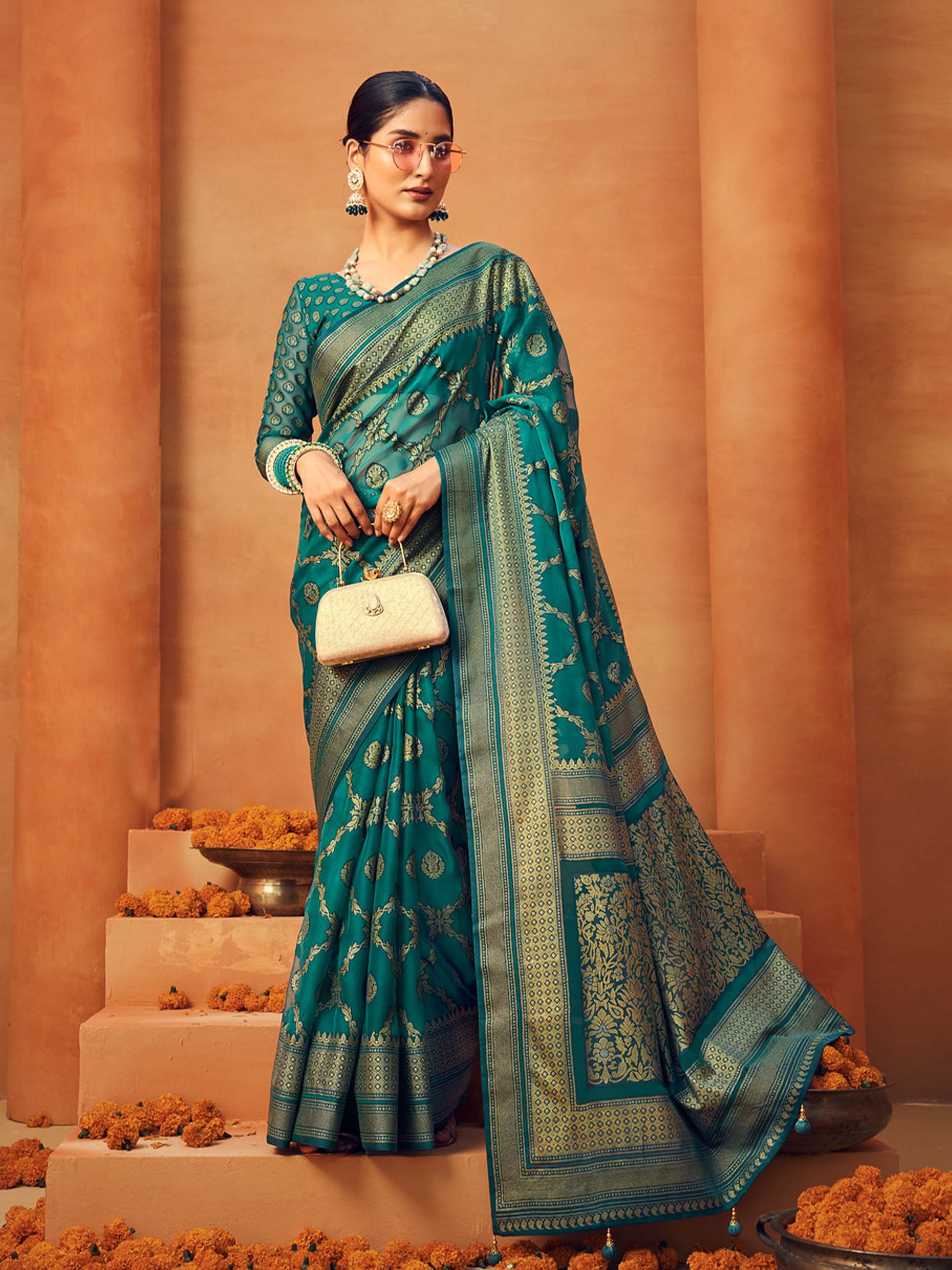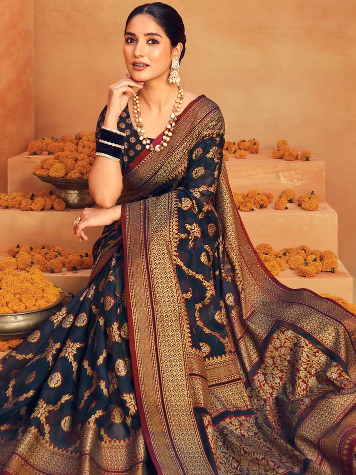 Our sarees are created using a combination of modern weaving technologies (like jacquard, air-jet, and rapier looms) and traditional craftsmanship. Fabrics are processed, finished, and often embellished in-house to ensure consistent quality.