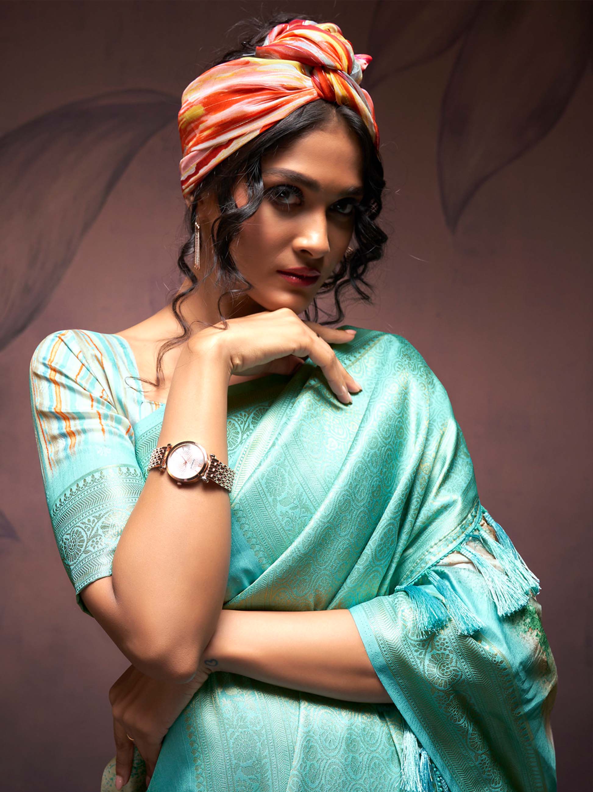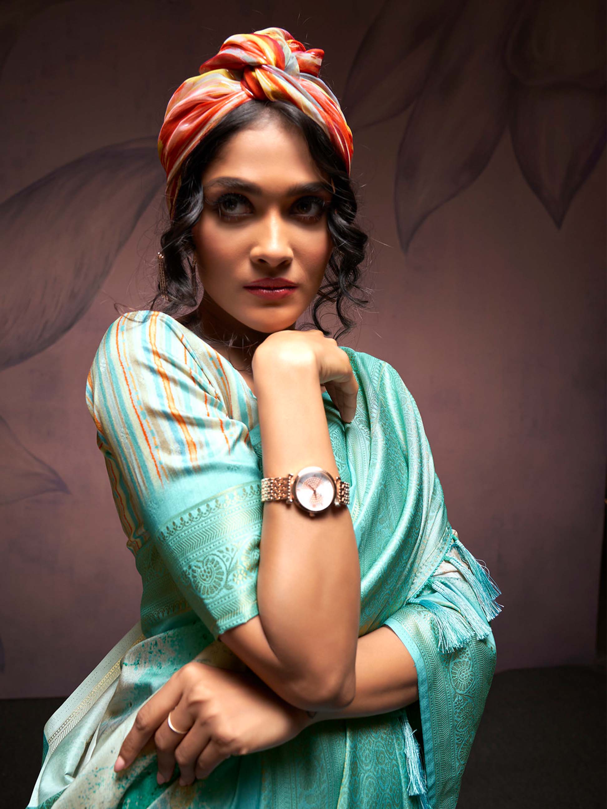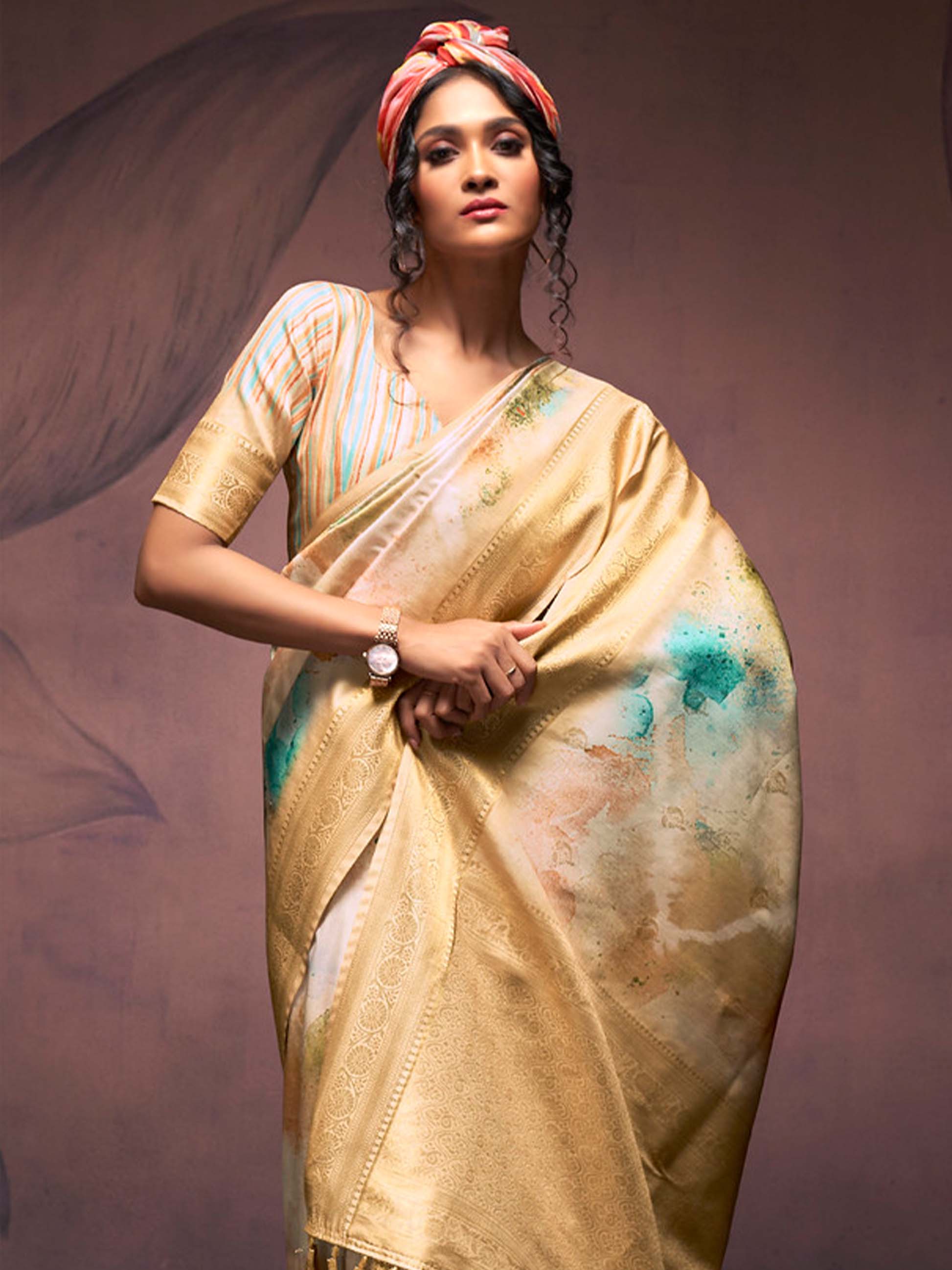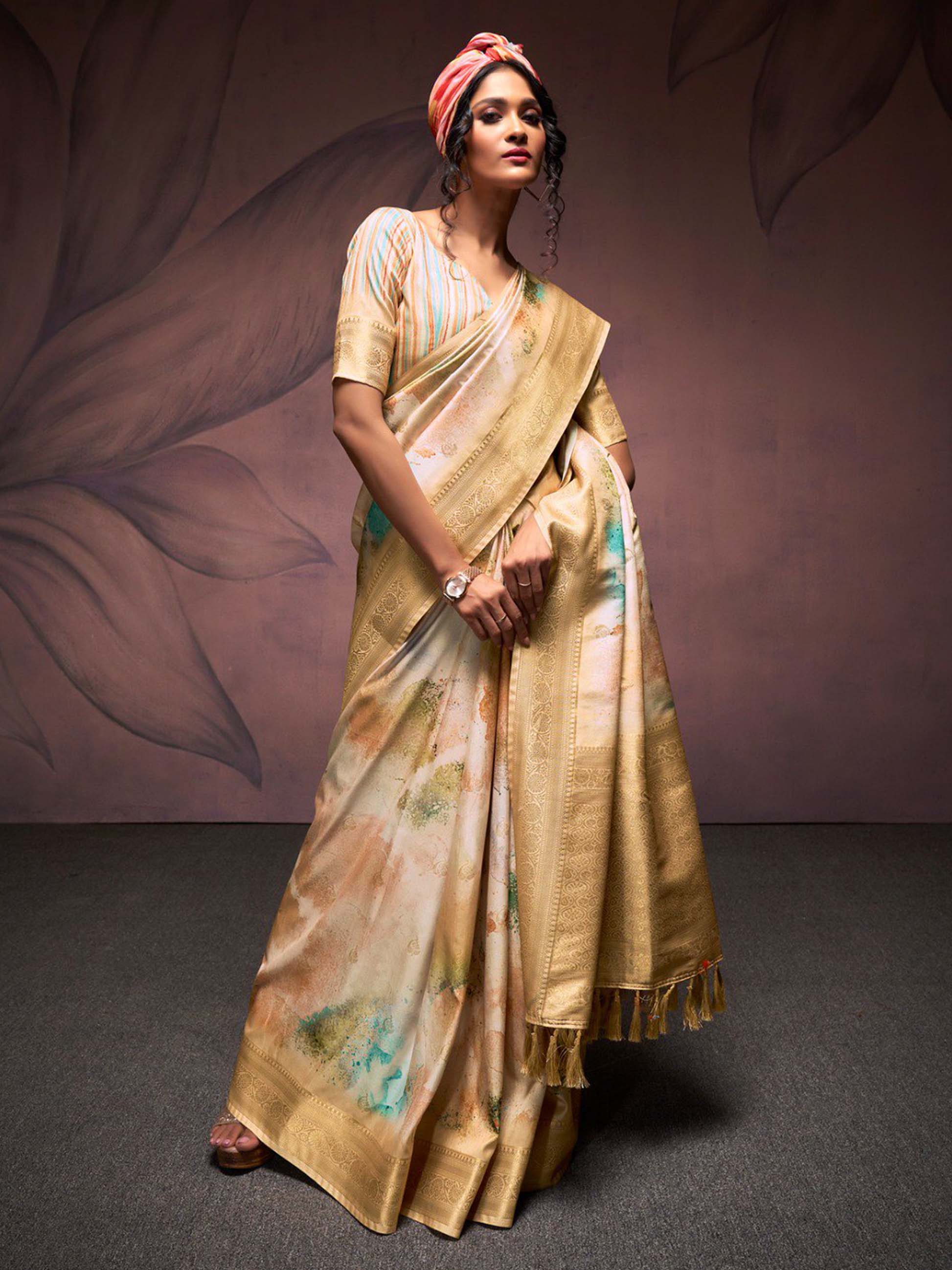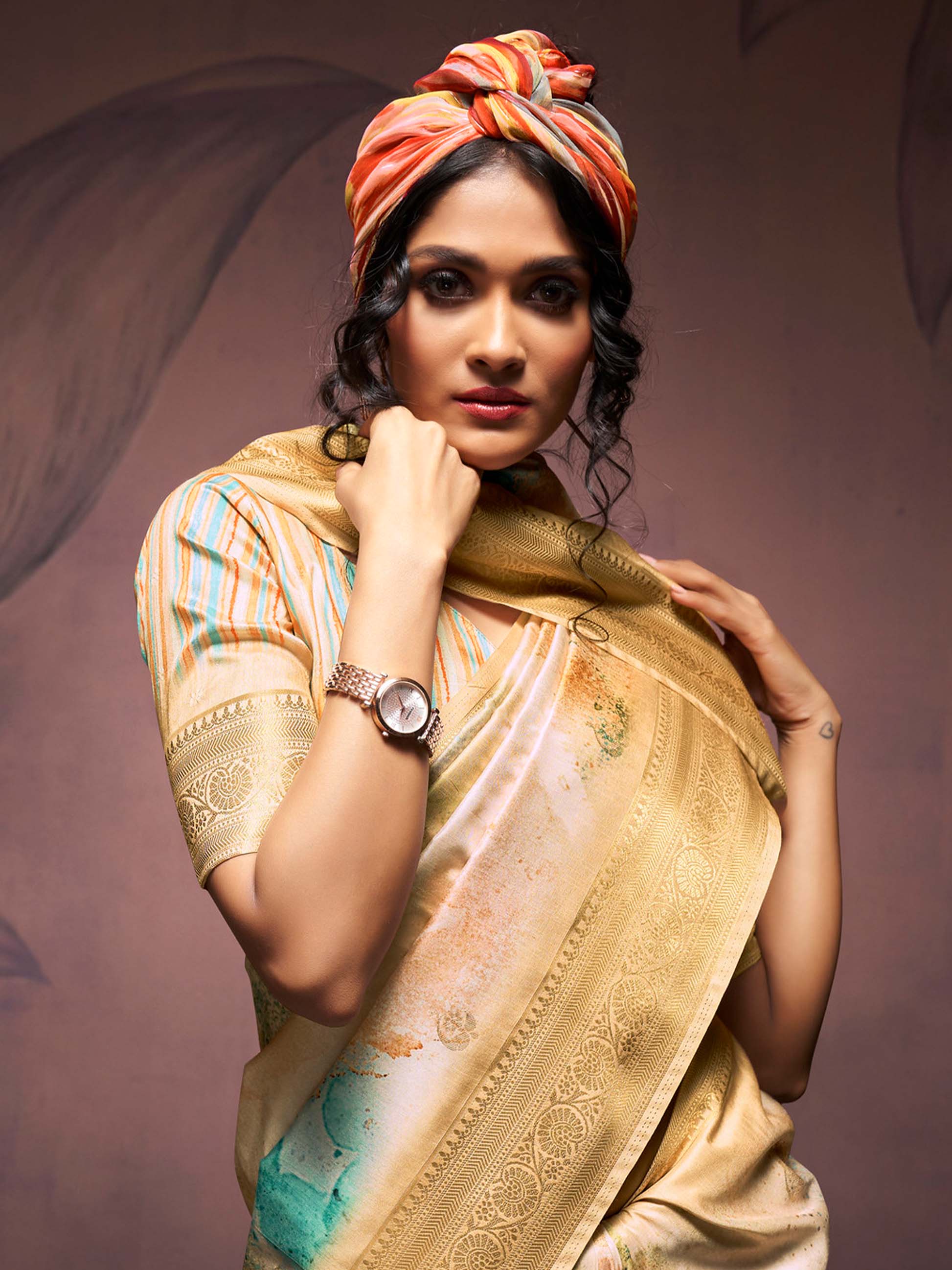 Our sarees are created using a combination of modern weaving technologies (like jacquard, air-jet, and rapier looms) and traditional craftsmanship. Fabrics are processed, finished, and often embellished in-house to ensure consistent quality.