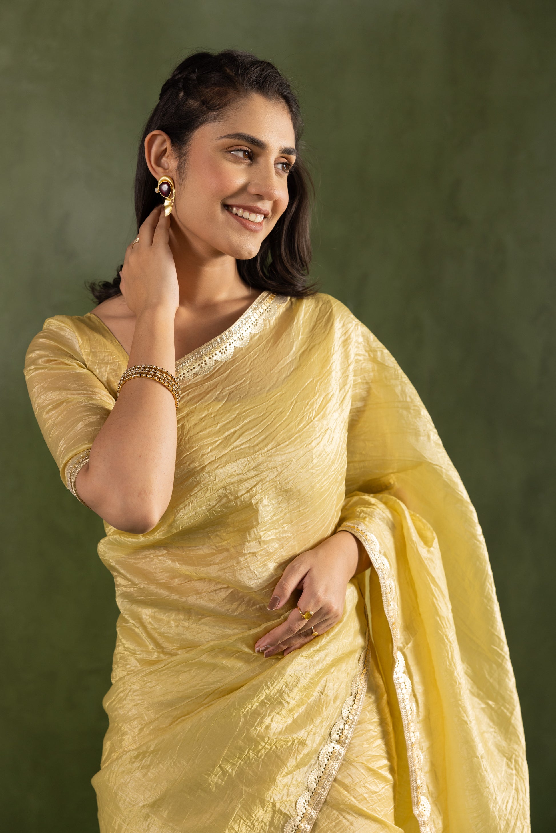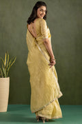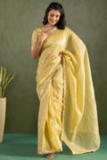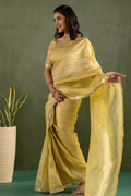 Elevate your ethnic wardrobe with this radiant Crushed Tissue Silk Ready-to-Wear Saree in a delicate sunshine yellow hue. Lightweight, lustrous, and effortlessly elegant, this saree blends traditional charm with a modern silhouette – perfect for those who seek beauty in simplicity.
