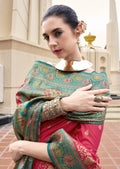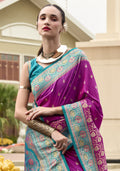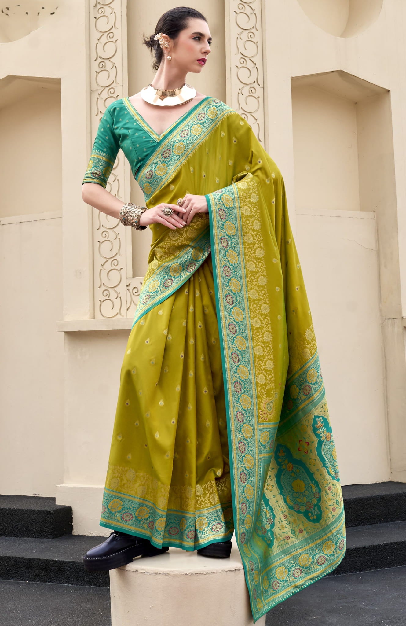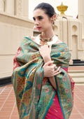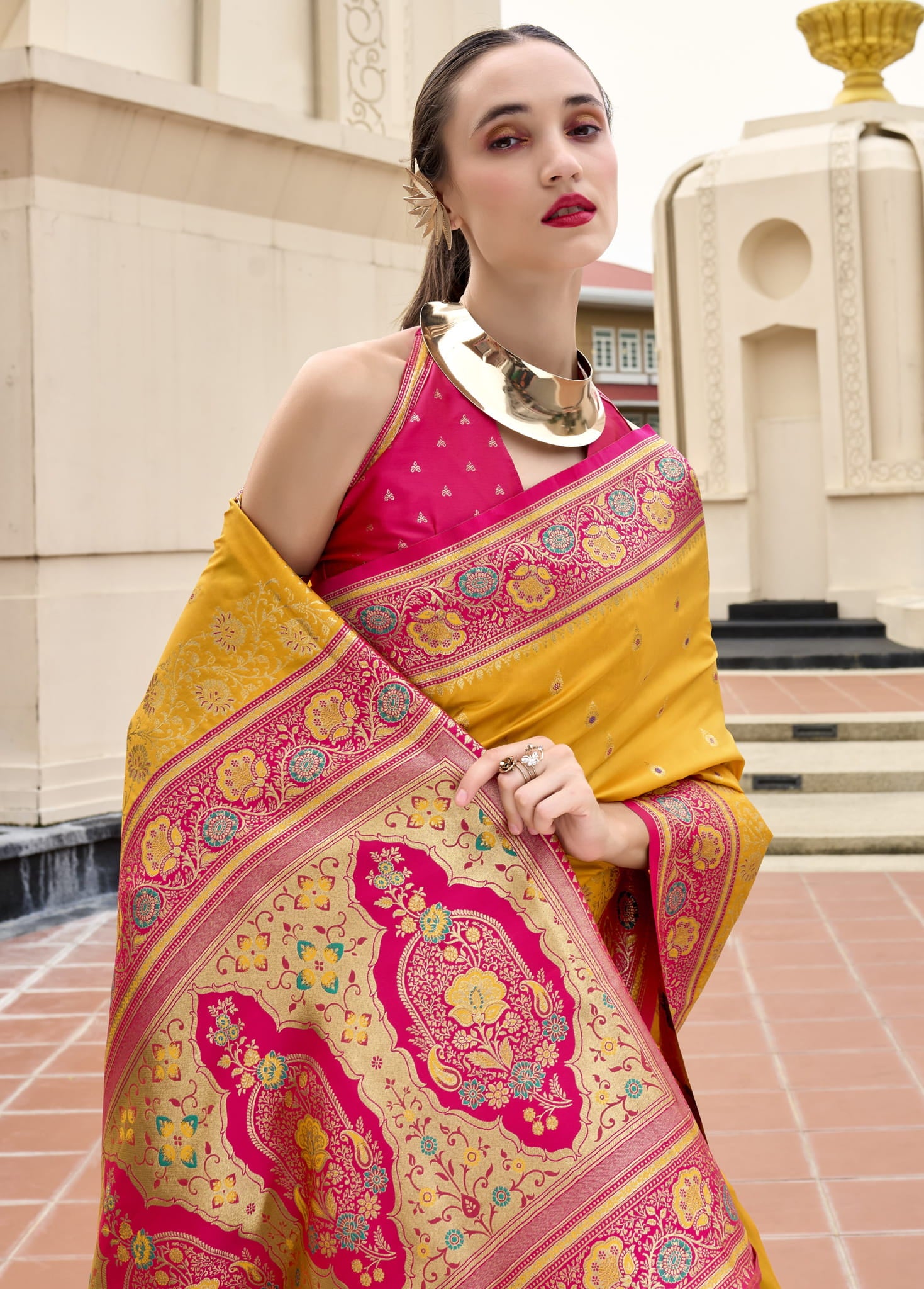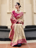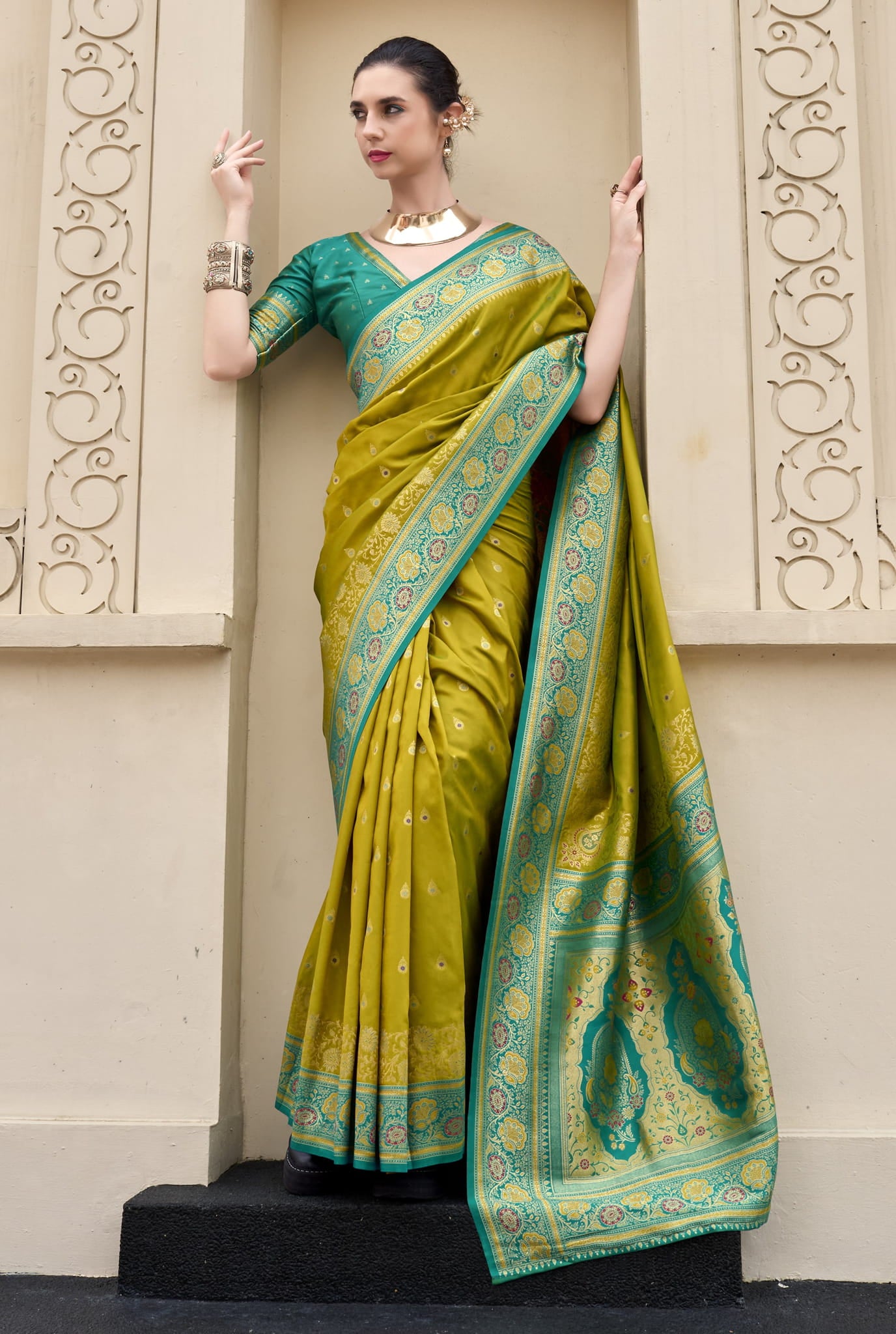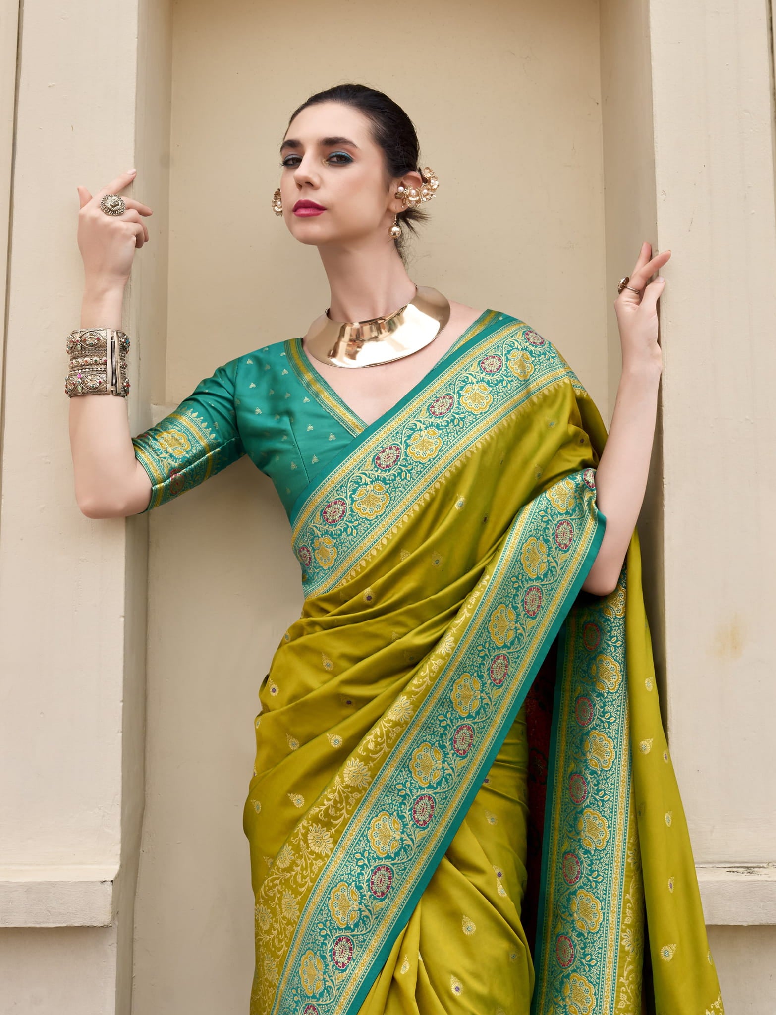 Step into timeless grace with this intricately woven Banarasi saree, designed to make a statement. The saree features traditional motifs and a grand pallu highlighted by ornate patterns and fine craftsmanship. A broad, ornate border runs along the length, enhancing its royal appeal. Ideal for weddings, festive occasions, and grand celebrations, it comes with a beautifully coordinated unstitched blouse piece.