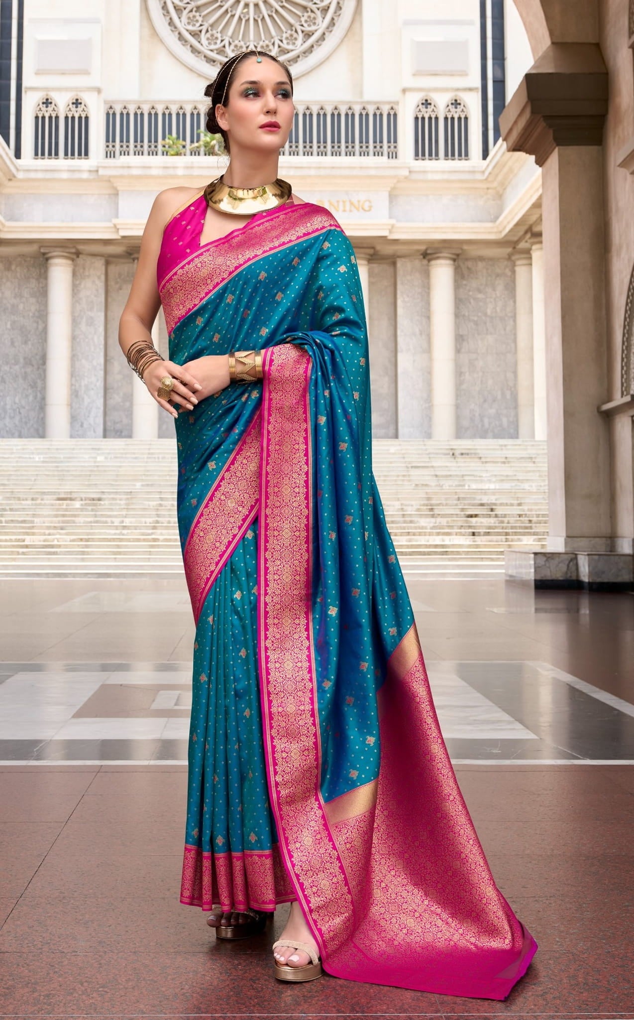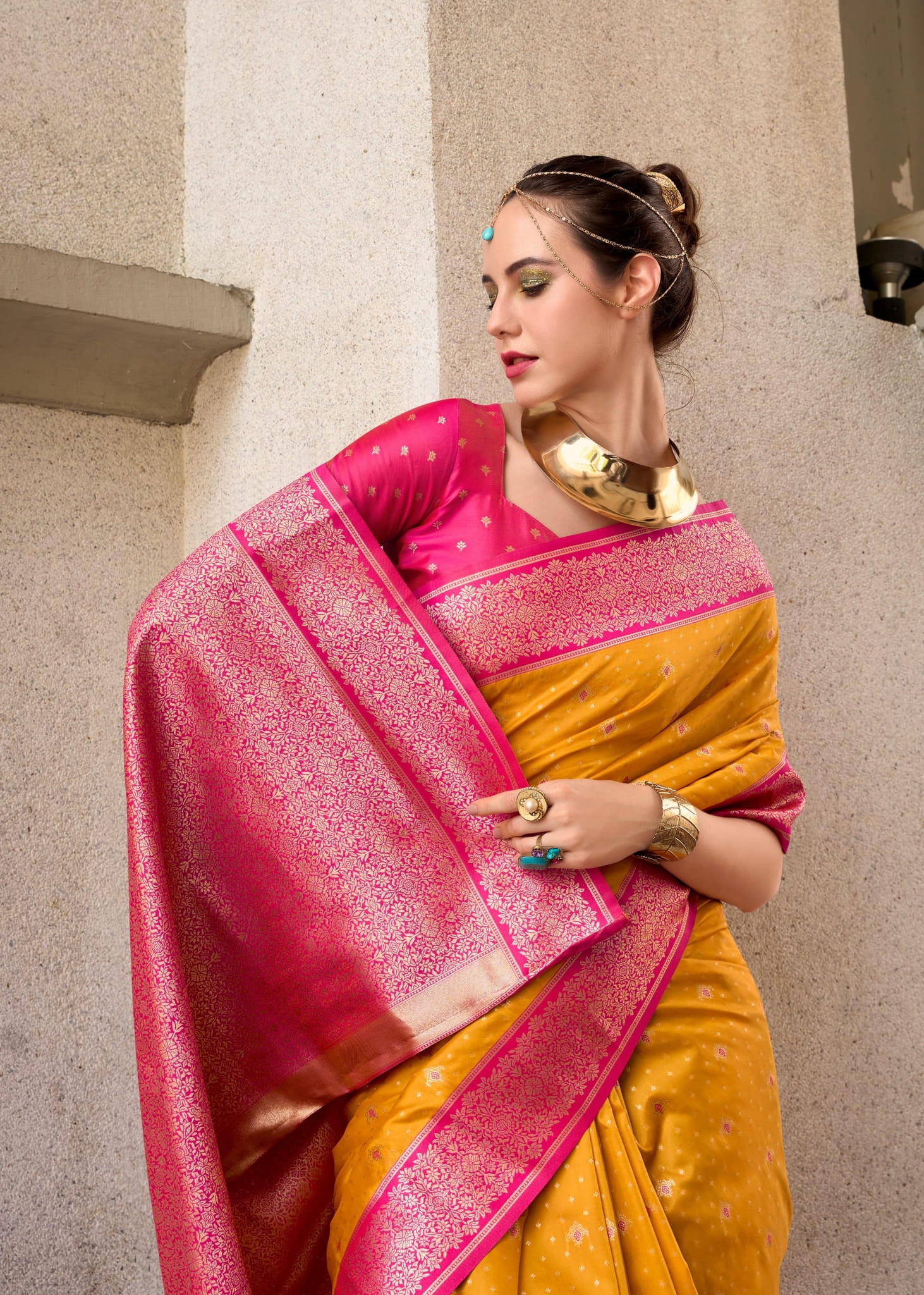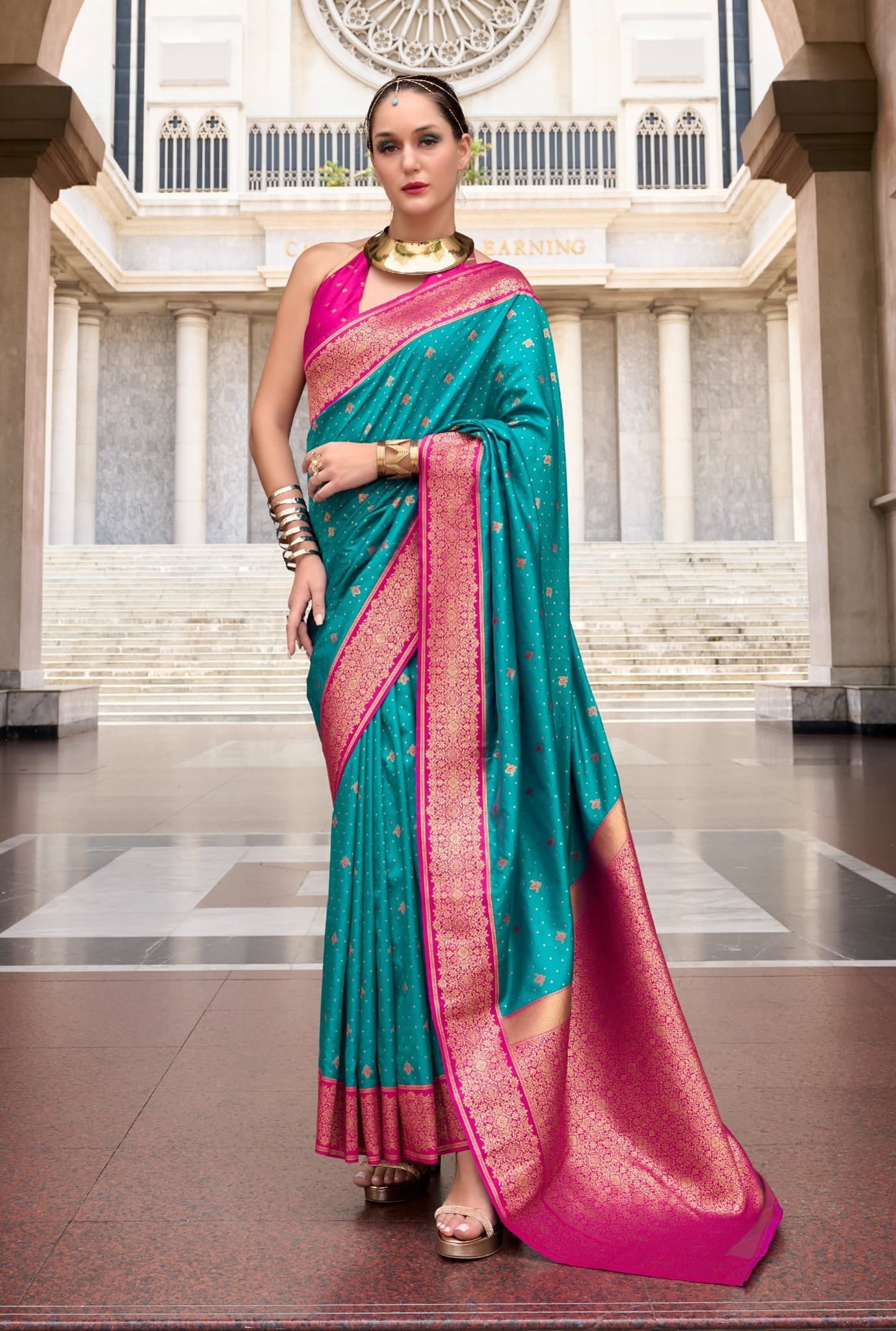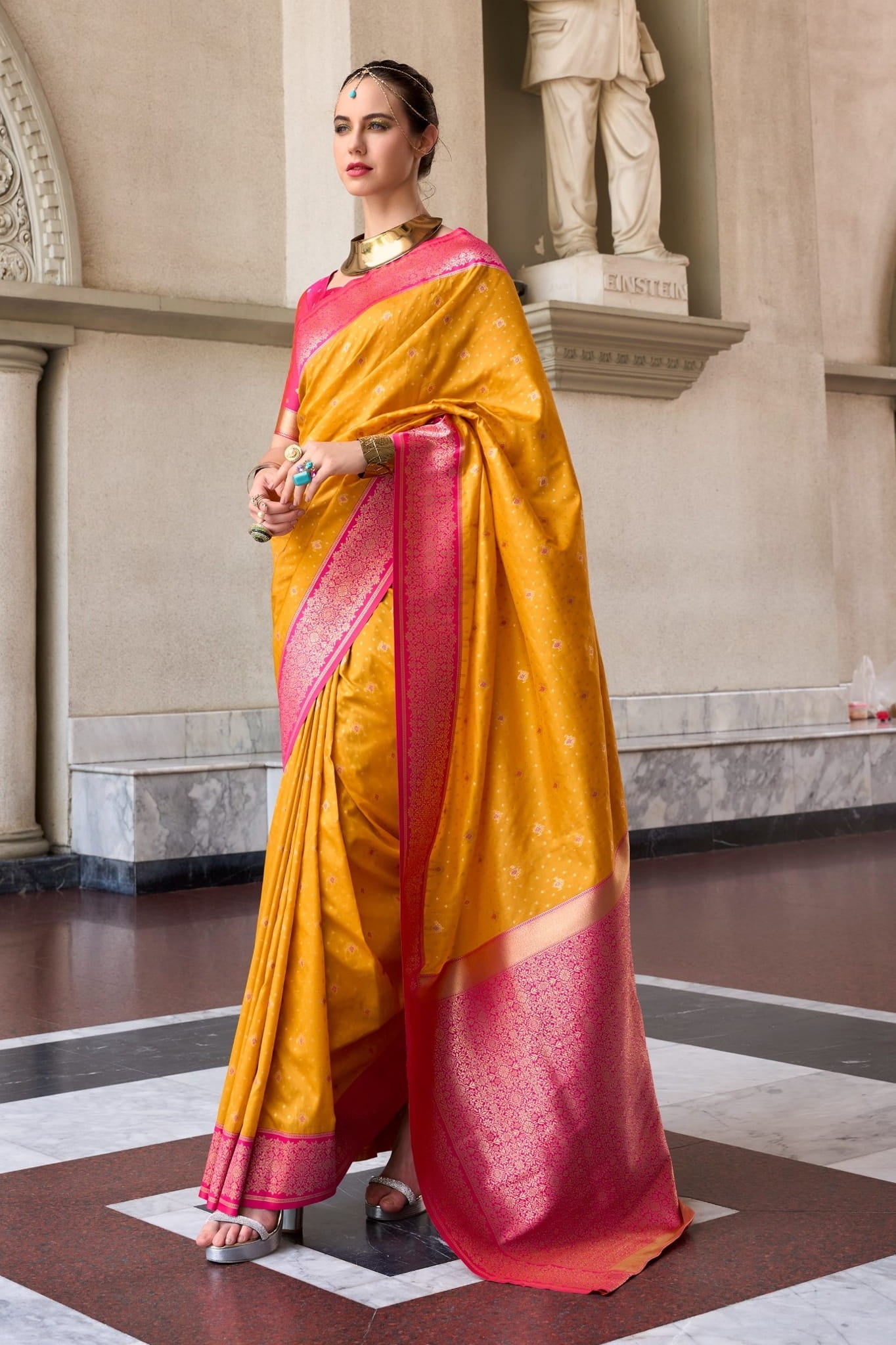 Design: All-over Golden Buttas with Contrasting Rich Pallu and Border