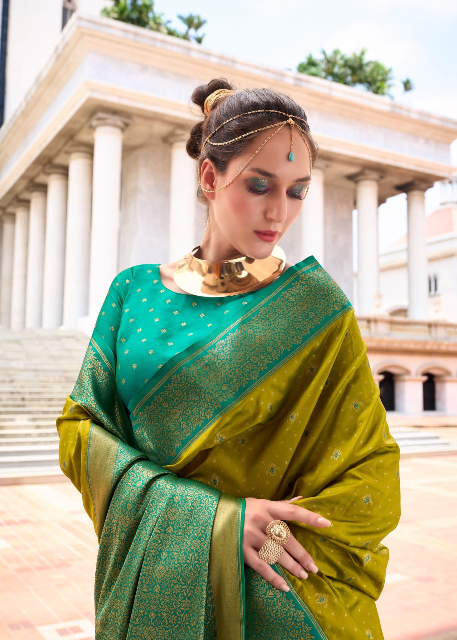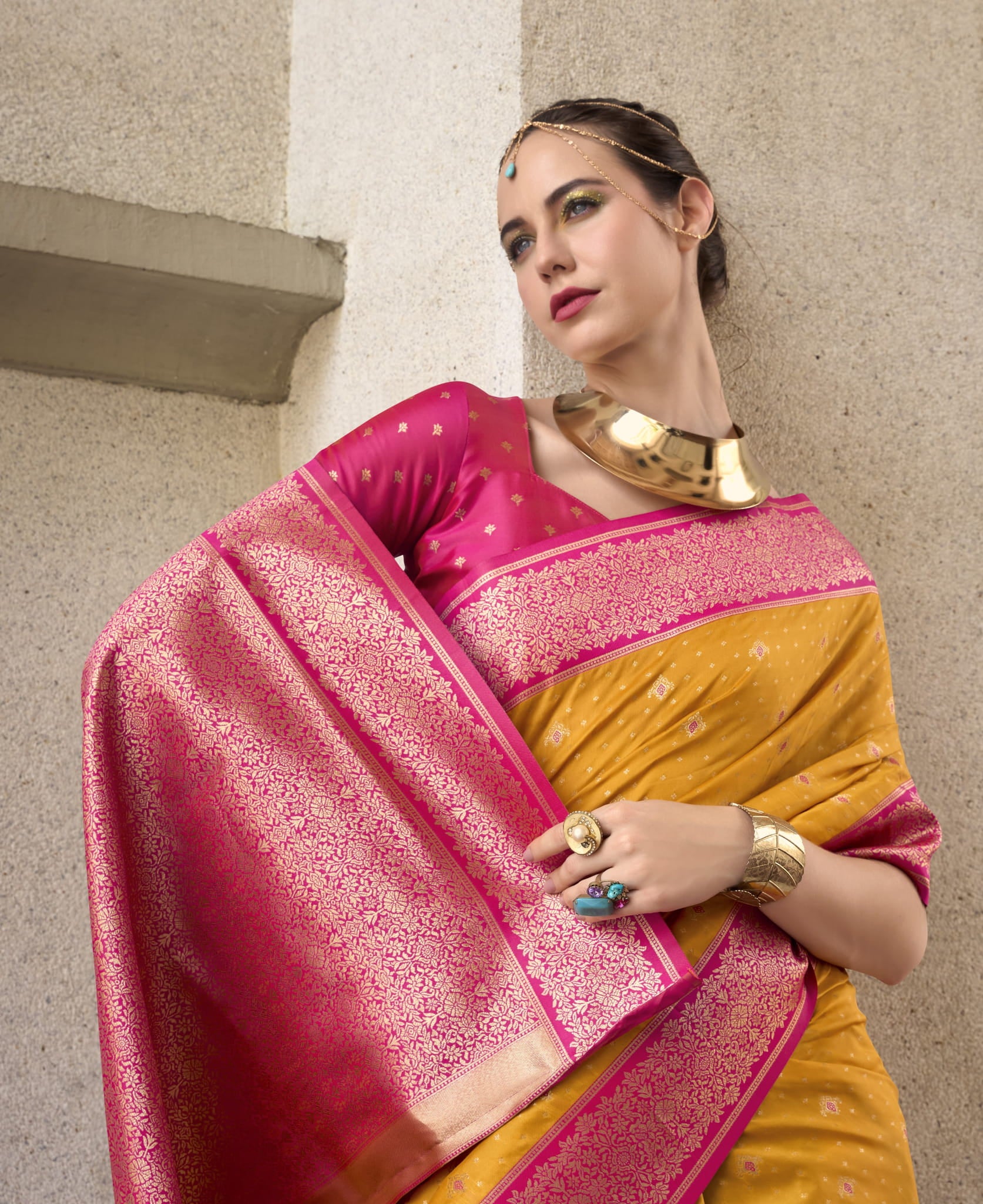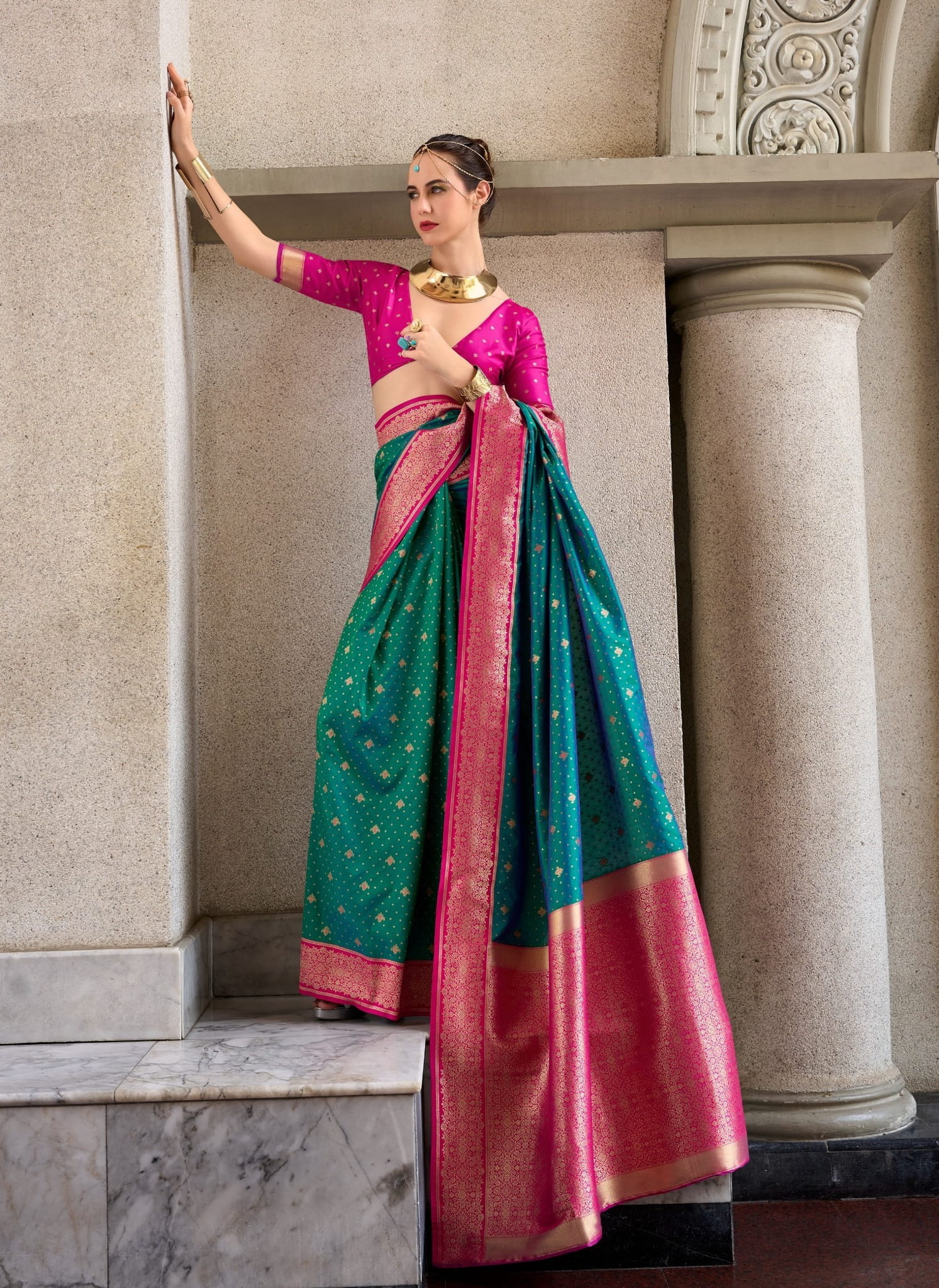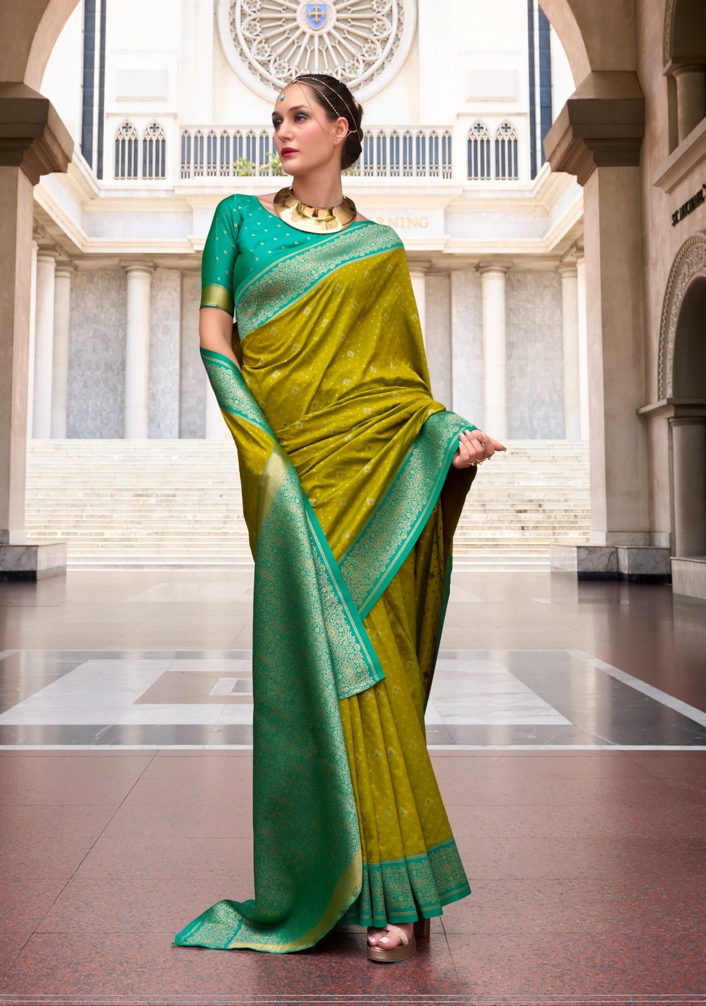 Design: All-over Golden Buttas with Contrasting Rich Pallu and Border