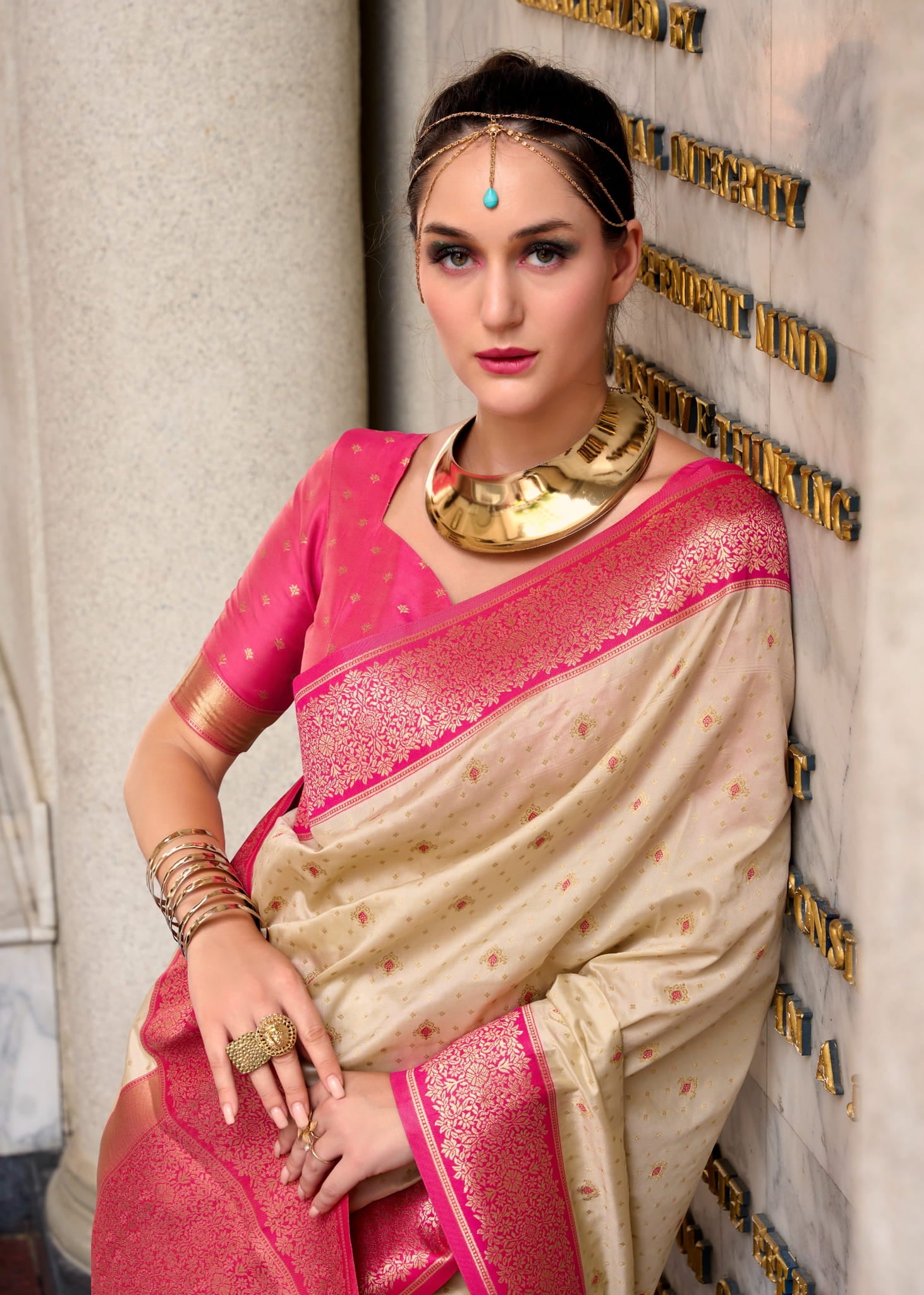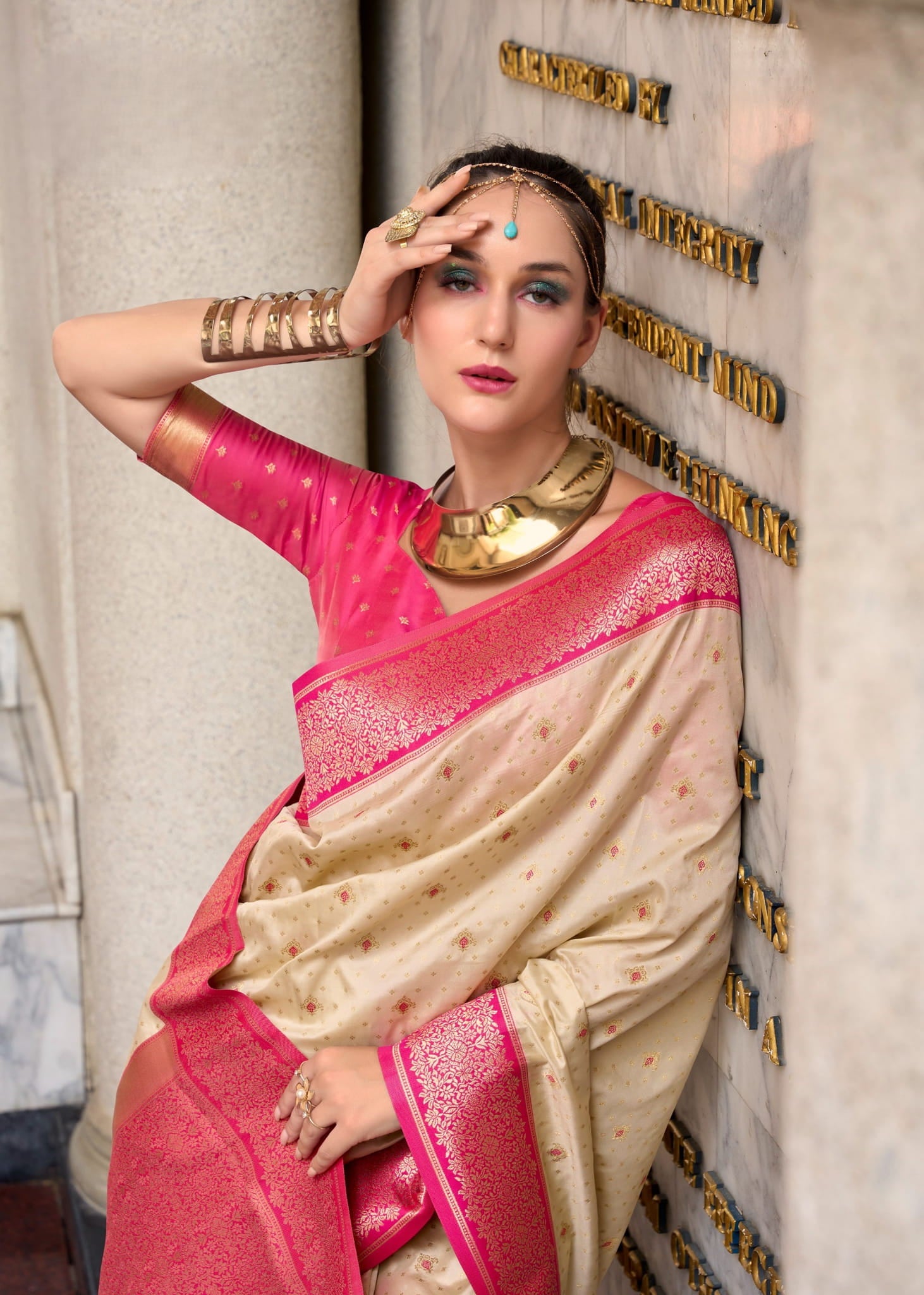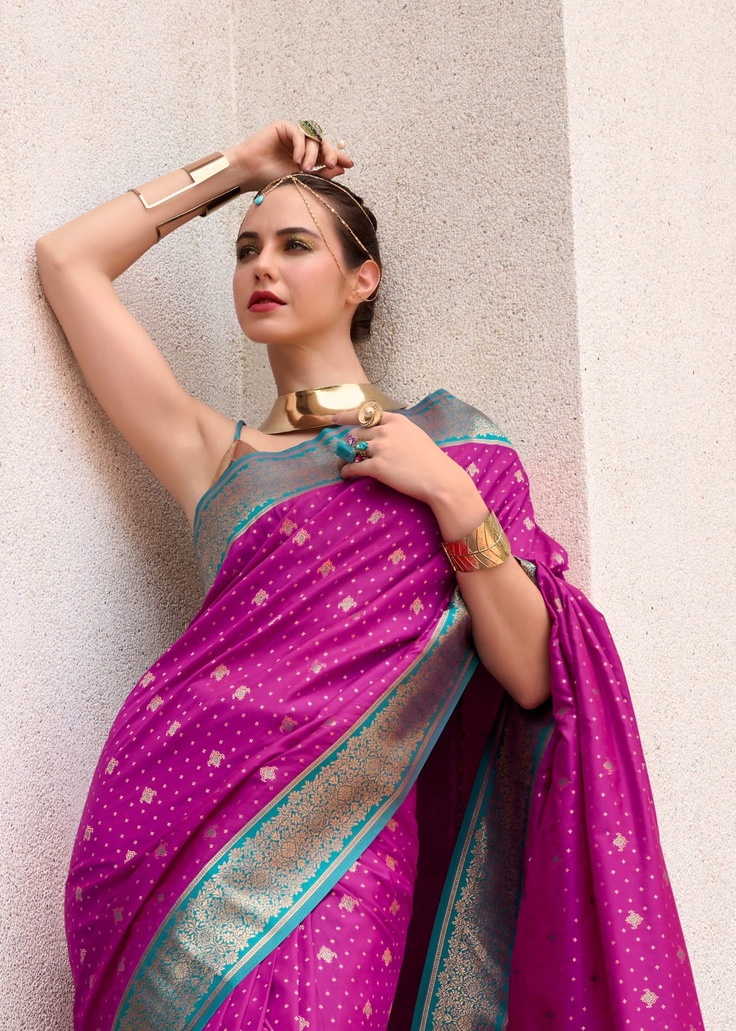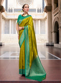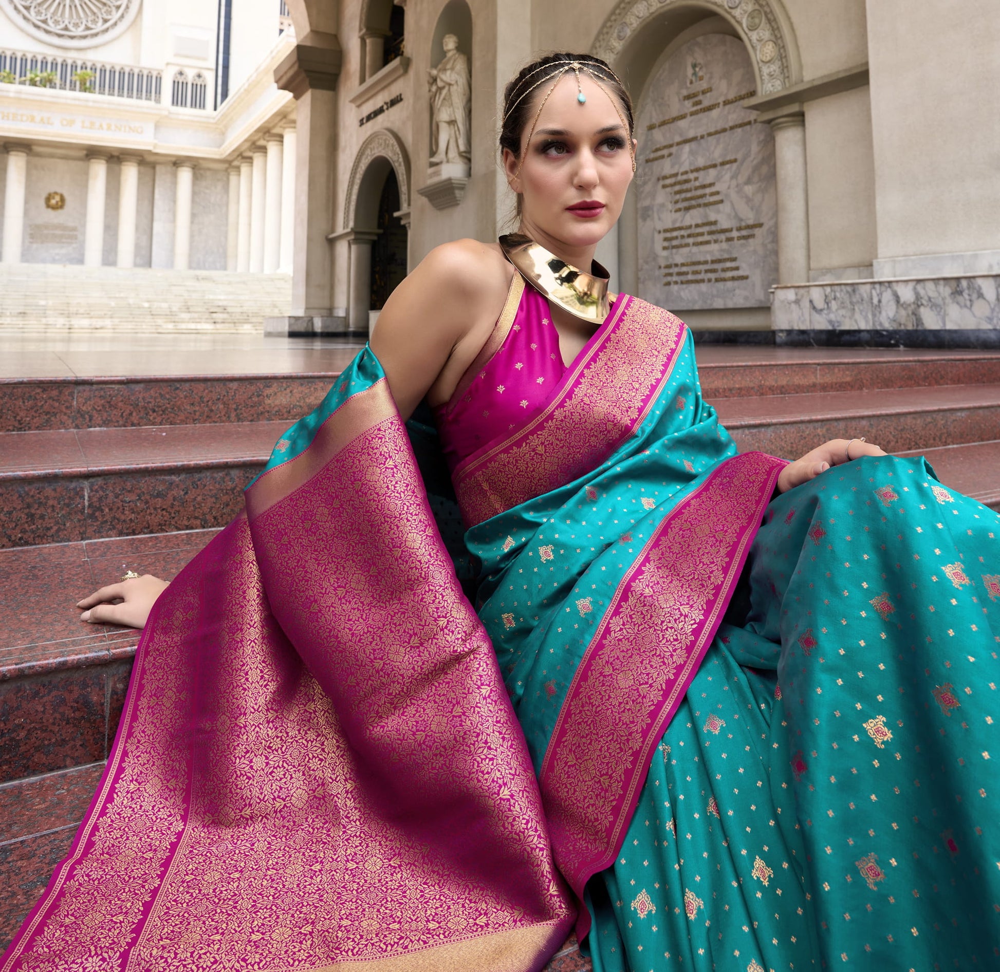Design: All-over Golden Buttas with Contrasting Rich Pallu and Border